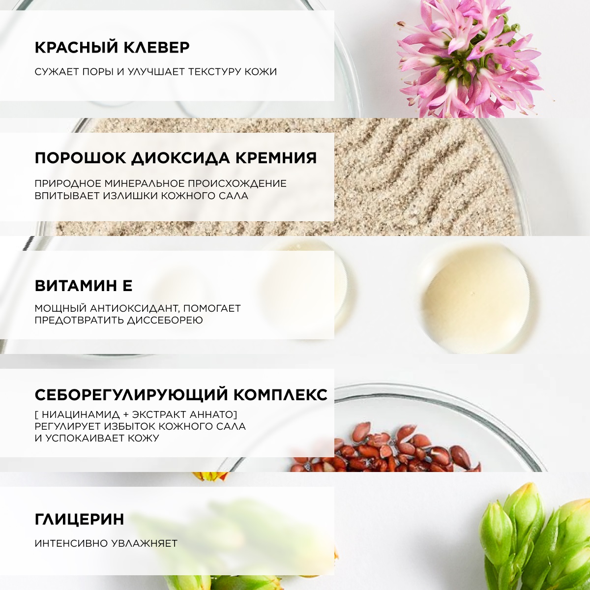 Состав: вода, глицерин, кремнезем, кукурузный крахмал (zea mays), ниацинамид, дикаприлил карбонат, изопентилдиол, 1,2-гександиол, лауроил лизин, глицерил каприлат, акрилаты/ c10-30 алкил акрилат кроссполимер, микрокристаллическая целлюлоза, хлорфенезин, парфюм (отдушка), мальтодекстрин, экстракт семян bixa orellana, токоферил ацетат, экстракт цветов trifolium pratense (клевер), гидроксид натрия, гиалуронат натрия, целлюлозная камедь, токоферол.
