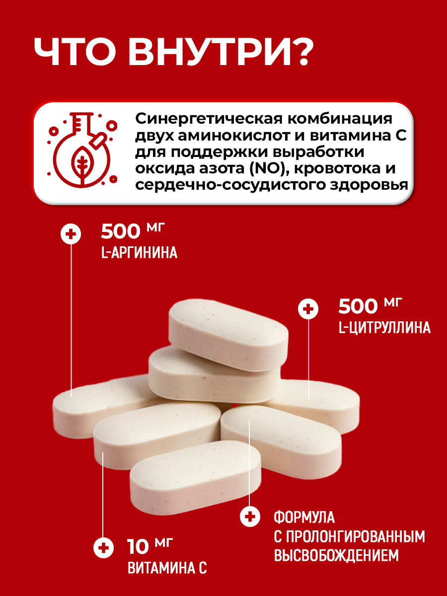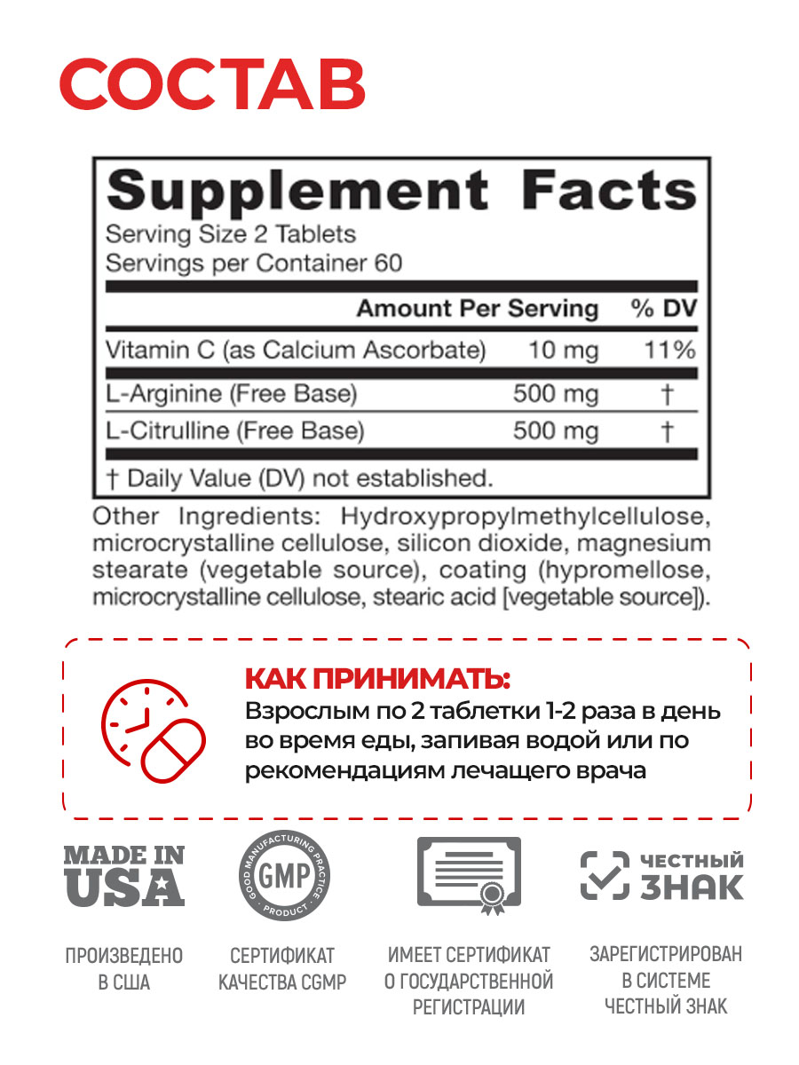 Состав: загуститель гидроксипропилметилцеллюлоза Е464, L-аргинин, L-цитруллин (из капусты), антислеживающий агент микрокристаллическая целлюлоза Е460i, антислеживающий агент диоксид кремния аморфный Е551, антислеживающий агент магниевая соль стеариновой кислоты Е470b, L-аскорбат кальция, таблеточное покрытие (загуститель гидроксипропилметилцеллюлоза Е464, антислеживающий агент микрокристаллическая целлюлоза Е460i, стабилизатор стеариновая кислота Е570).