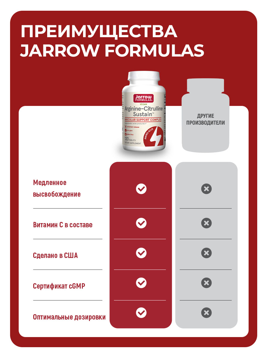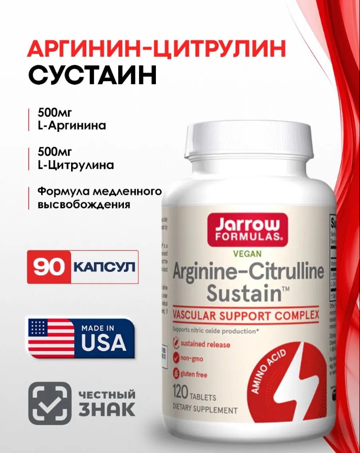 Jarrow Formulas Arginine & Citrulline Sustain – комбинированная добавка, содержащая две аминокислоты аргинин и цитруллин. Разработана для поддержки сердечно-сосудистой системы, улучшения кровообращения и повышения физической выносливости.