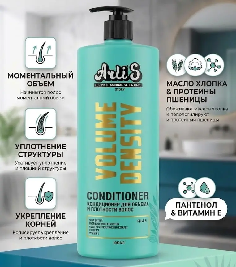 Arli`S Story Volume Density - профессиональный кондиционер для поддержания структурной плотности и стойкого объёма волос с защитой от сухости по длине. Облегчает сушку волос, делая пряди более послушными, упругими, что позволяет значительно дольше сохранить форму укладки и свежесть волос.