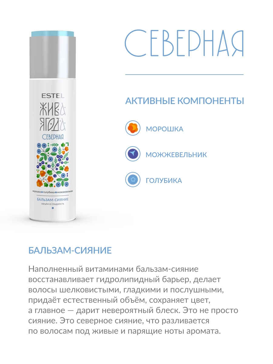 Наполненный витаминами, бальзам-сияние восстанавливает гидролипидный барьер, делает волосы шелковистыми, гладкими и послушными, придаёт естественный объём, сохраняет цвет, а главное — дарит невероятный блеск. Это не просто сияние. Это северное сияние, что разливается по волосам под живые и парящие ноты аромата.