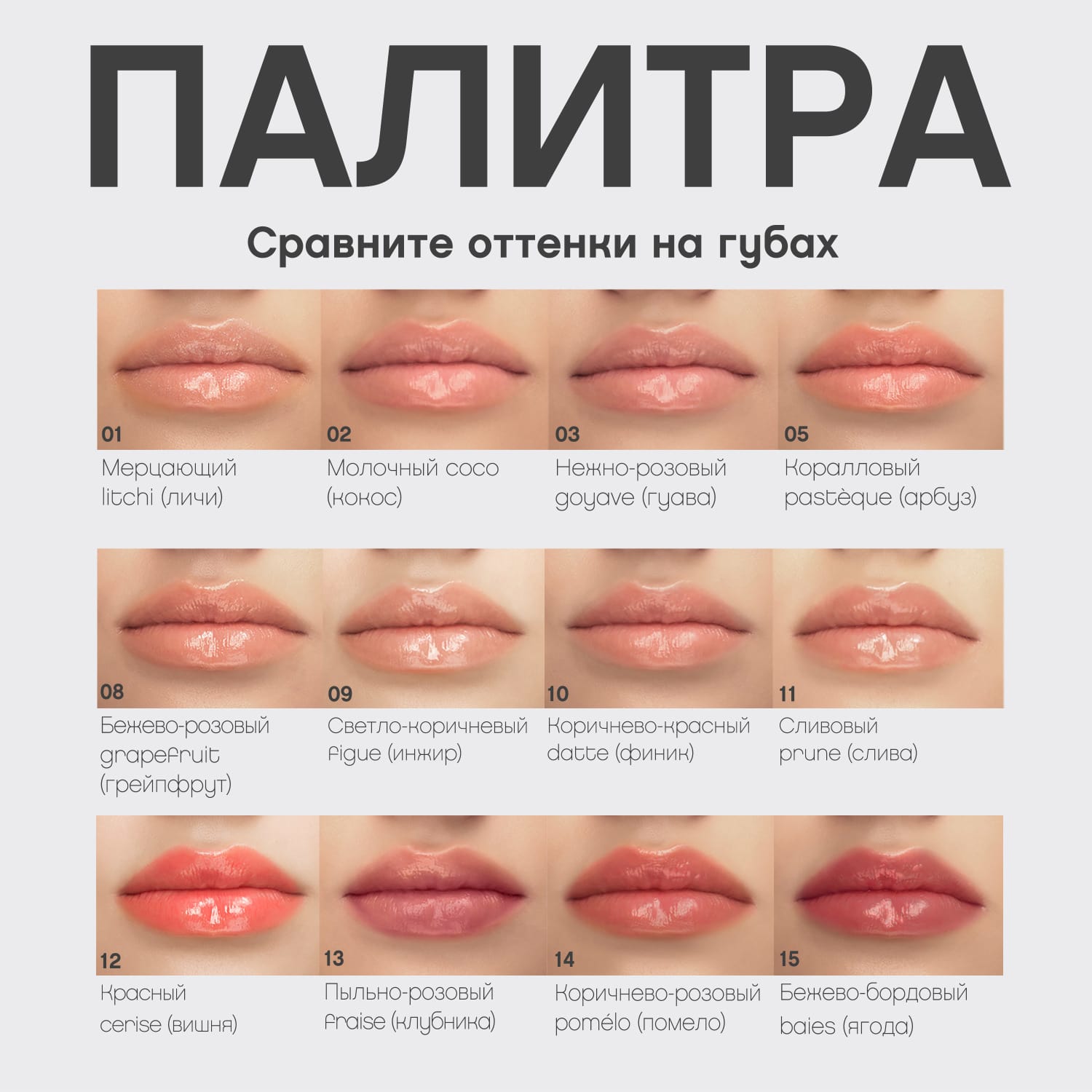 12 универсальных полупрозрачных оттенков на каждый день. Суперглянцевый влажный финиш создает эффект объемных, сексуальных губ. Не растекается и надолго сохраняет влажный блеск. Имеет приятный ягодный аромат.