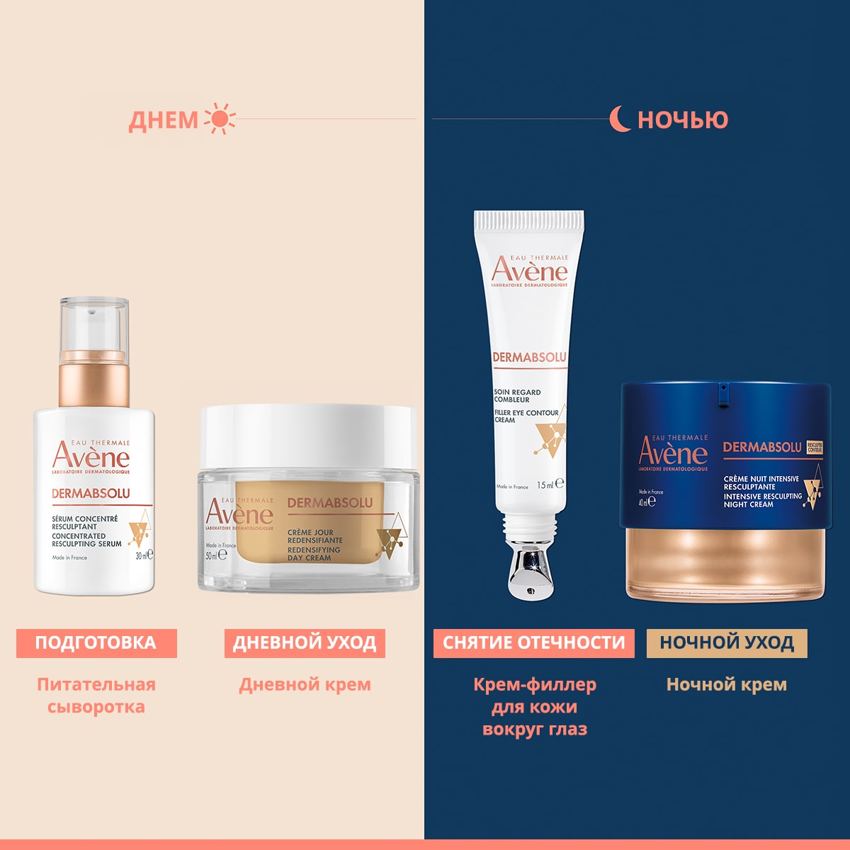 Дневной крем Avene Dermabsolu восстанавливает треугольник молодости (овал лица), уплотняет кожу, восстанавливает контуры лица, осветляет и выравнивает тон лица, интенсивно питает, борется с признаками старения.