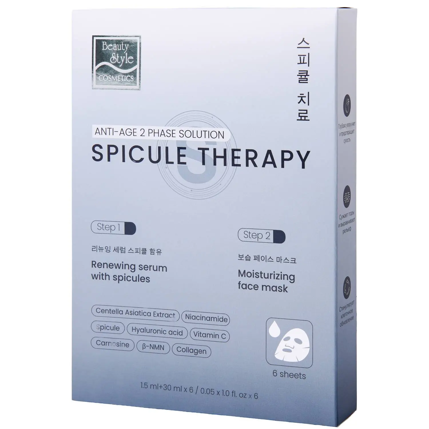 Двухэтапный уход для обновления кожи любого типа: сыворотка со спикулами выравнивает текстуру, уменьшает пигментацию и признаки увядания. Ее действие дополняет увлажняющая маска с центеллой и коллагеном, которая восстанавливает, наполняет влагой и успокаивает. Удобный формат в одном саше — процедура, доступная в любое время.