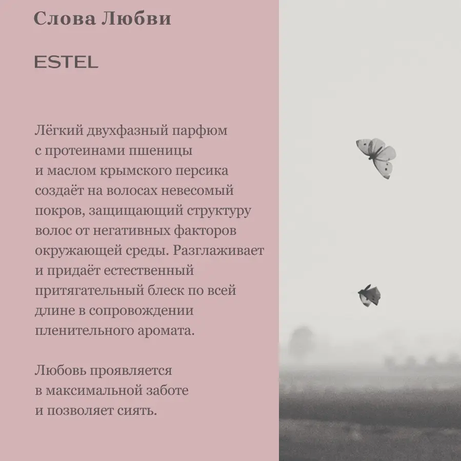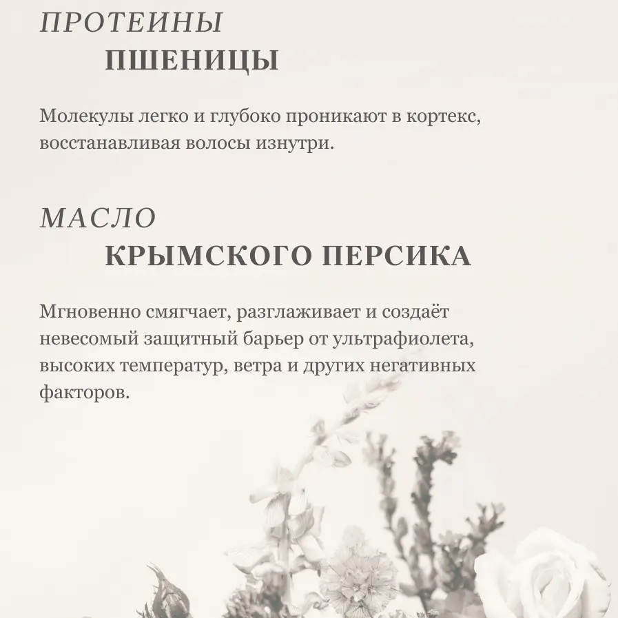 Лёгкий двухфазный парфюм для волос с протеинами пшеницы и маслом крымского персика защищает волосы от негативных факторов окружающей среды и придаёт естественный притягательный блеск по всей длине в сопровождении пленительного аромата.