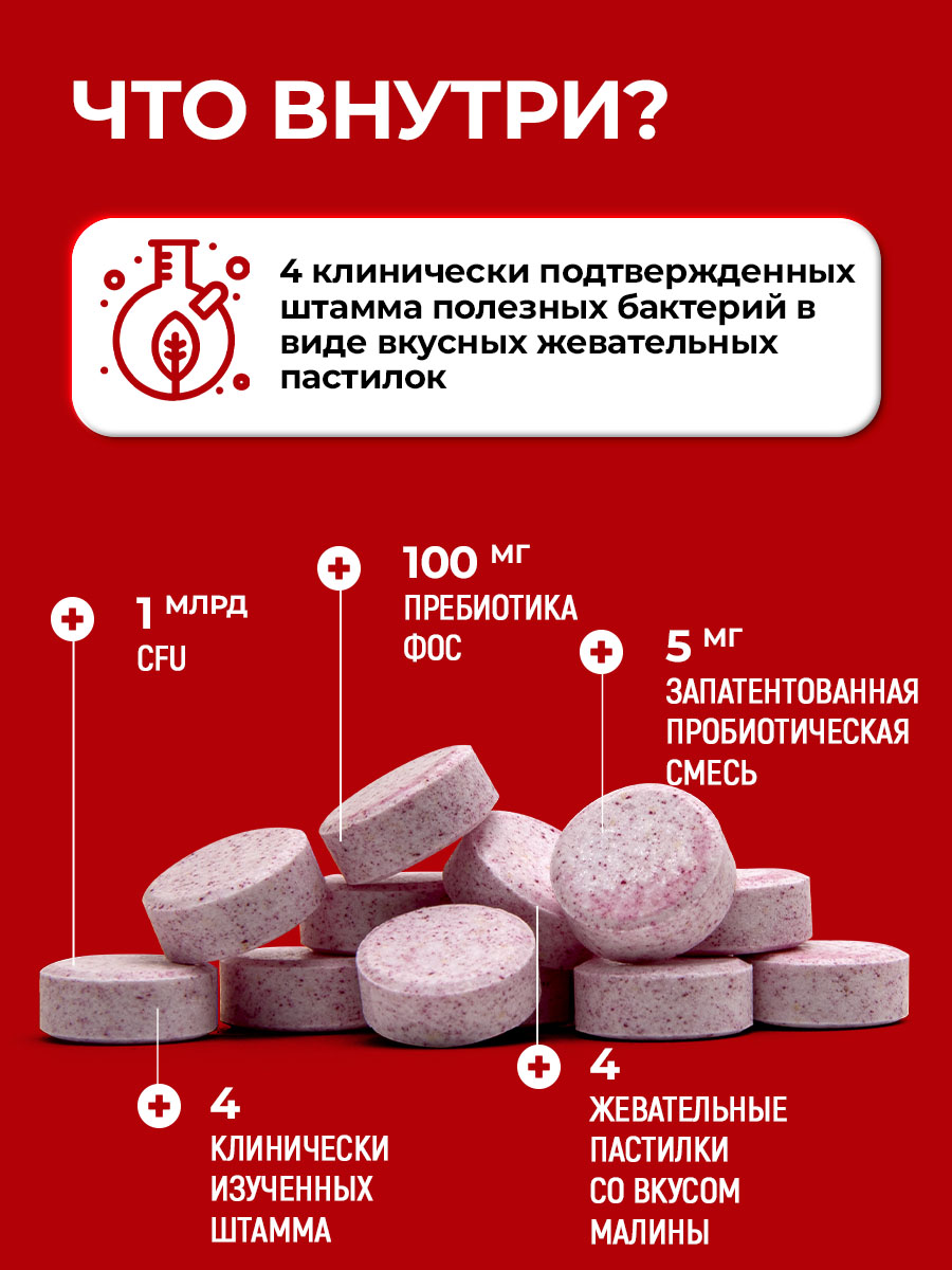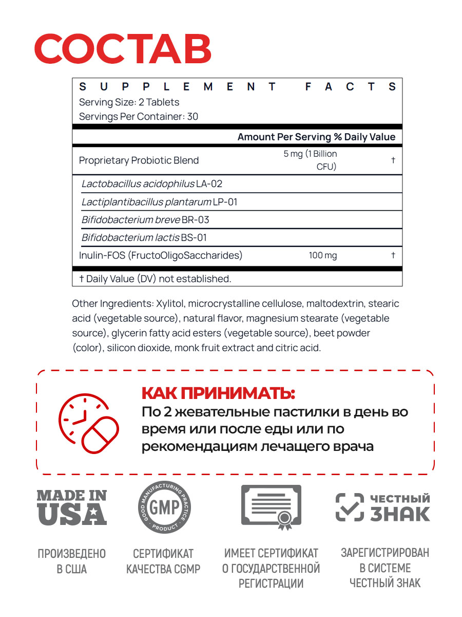 Состав: ксилит(агент влагоудерживатель), микрокристаллическая целлюлоза, инулин-ФОС (фруктоолигосахариды), стеариновая кислота (растительного происхождения), натуральный малиновый ароматизатор, смесь пробиотиков (Lactobacillus acidophilus LA-02, Lactobacillus plantarum LP-1, Bifidobacterium breve BR-03, Bifidobacterium lactic BS-01), стеарат магния (растительного происхождения), сложные эфиры жирных кислот глицерина (растительного происхождения), свекольный порошок (краситель), диоксид кремния, экстракт плодов монаха, лимонная кислота.