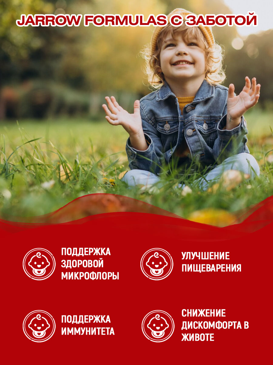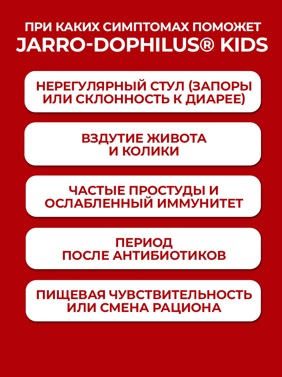 Jarro-Dophilus Kids содержит 4 клинически подтвержденных штамма полезных бактерий во вкусной жевательной таблетке. Диета с низким содержанием клетчатки, высоким содержанием животного белка, приемом лекарств, путешествиями и стрессами - негативно влияет на полезную кишечную флору. Дружественные бактерии в Jarro-Dophilus Kids помогают поддерживать сбалансированную микрофлору кишечника, поддерживают иммунную функцию и укрепляют здоровье.