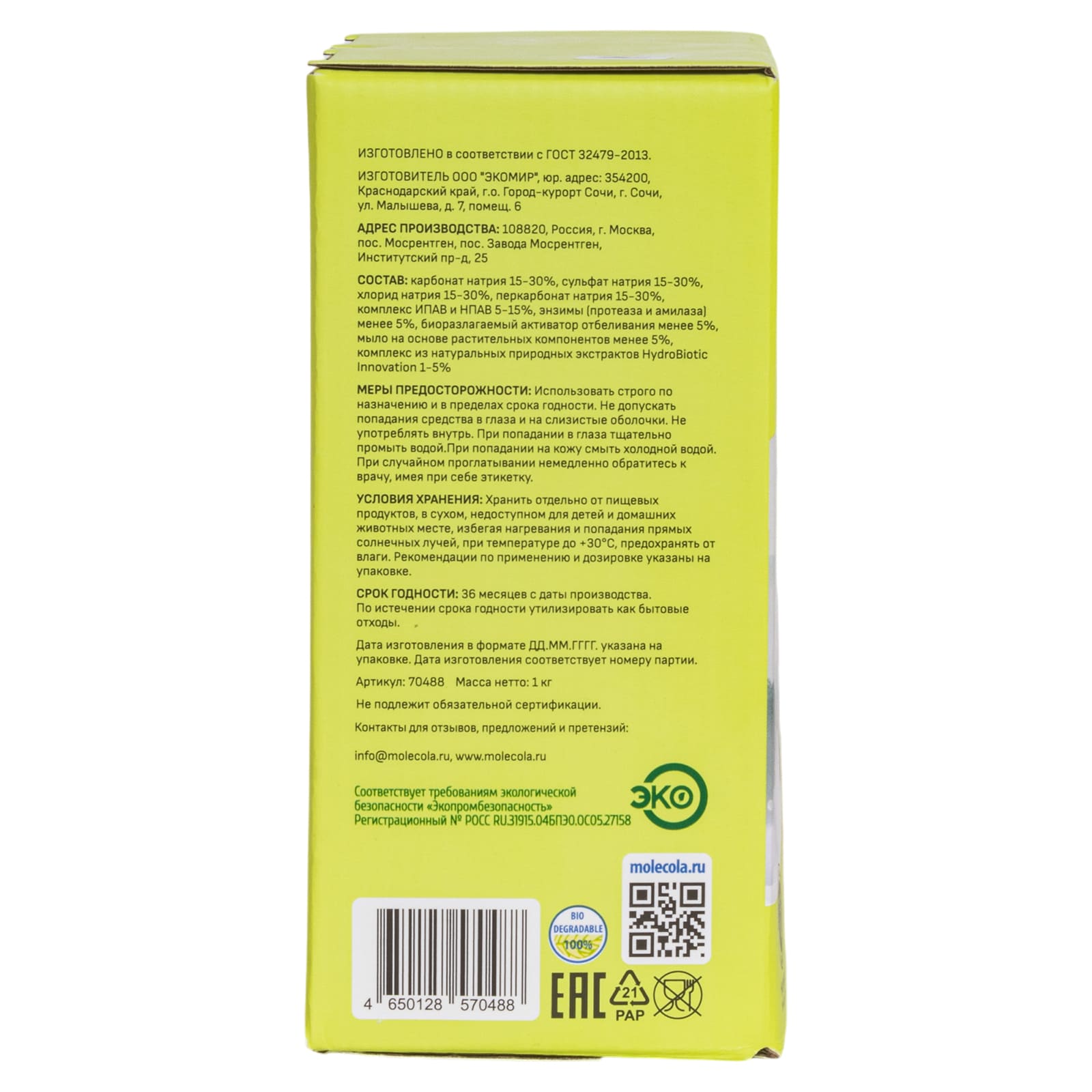 Состав: хлорид натрия 15-30%, карбонат натрия 20-35%, НПАВ 5-15%, перкарбонат натрия 5-15%, активатор кислородного отбеливателя менее 5%, энзимы 1%, ингибитор переноса красителя.