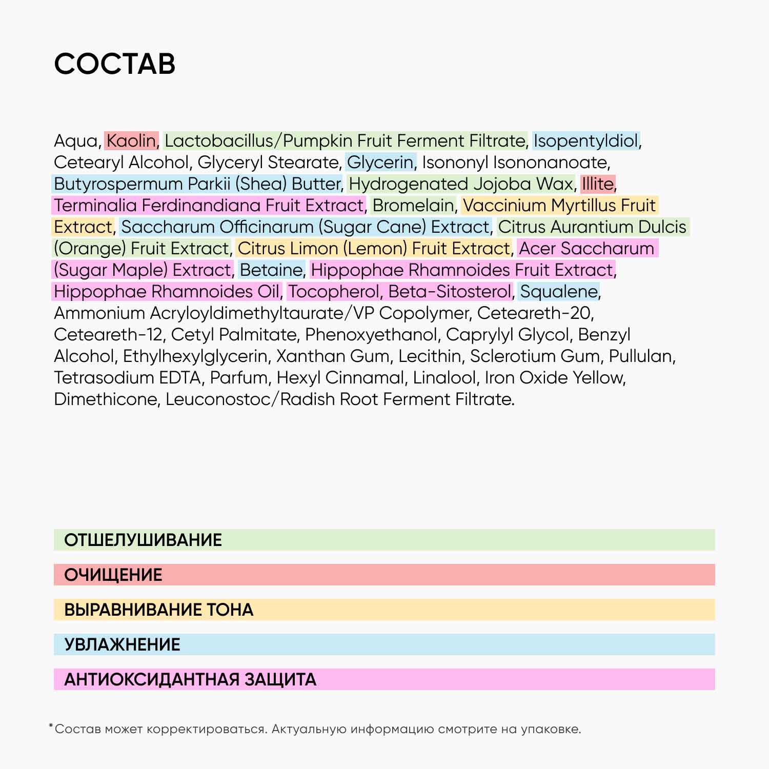 Состав: aqua, kaolin, lactobacillus/pumpkin fruit ferment filtrate, isopentyldiol, cetearyl alcohol, glyceryl stearate, glycerin, isononyl isononanoate,, butyrospermum parkii (shea) butter, hydrogenated jojoba wax, illite, terminalia ferdinandiana fruit extract, bromelain, vaccinium myrtillus fruit extract, saccharum o?cinarum (sugar cane) extract, citrus aurantium dulcis (orange) fruit extract, citrus limon (lemon) fruit extract, acer saccharinum (sugar maple) extract, betaine, hippophae rhamnoides extract, daucus carota sativa (carrot) root extract, glycine soja (soybean) oil, beta-carotene, tocopherol (mixed), beta sitosterol, squalene, ammonium acryloyldimethyltaurate/vp copolymer, ceteareth-20, ceteareth-12, cetyl palmitate, phenoxyethanol, caprylyl glycol, benzyl alcohol, xanthan gum, lecithin, sclerotium gum, pullulan, disodium edta, parfum, hexyl cinnamal, linalool, iron oxide yellow, dimethicone