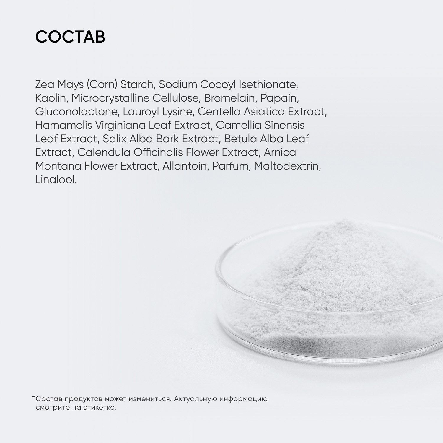 Состав: Zea Mays (Corn) Starch, Sodium Cocoyl Isethionate, Kaolin, Microcrystalline Cellulose, Bromelain, Papain, Gluconolactone, Lauroyl Lysine, Centella Asiatica Extract, Hamamelis Virginiana Leaf Extract, Camellia Sinensis Leaf Extract, Salix Alba Bark Extract, Betula Alba Leaf Extract, Calendula Officinalis Flower Extract, Arnica Montana Flower Extract, Allantoin, Parfum, Maltodextrin, Linalool