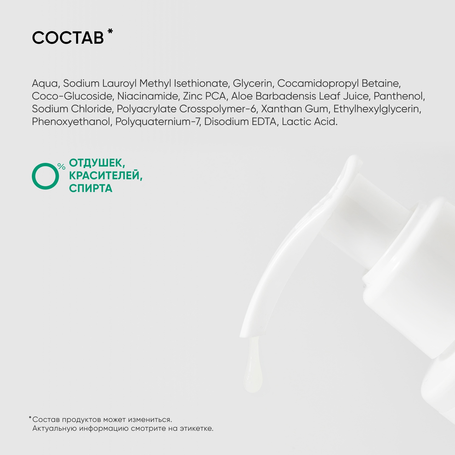 Состав: aqua, sodium lauroyl methyl isethionate, glycerin, cocamidopropyl betaine, coco-glucoside, niacinamide, zinc pca, aloe barbadensis leaf juice, panthenol, sodium chloride, polyacrylate crosspolymer-6, xanthan gum, ethylhexylglycerin, phenoxyethanol, polyquaternium-7, disodium edta, lactic acid.