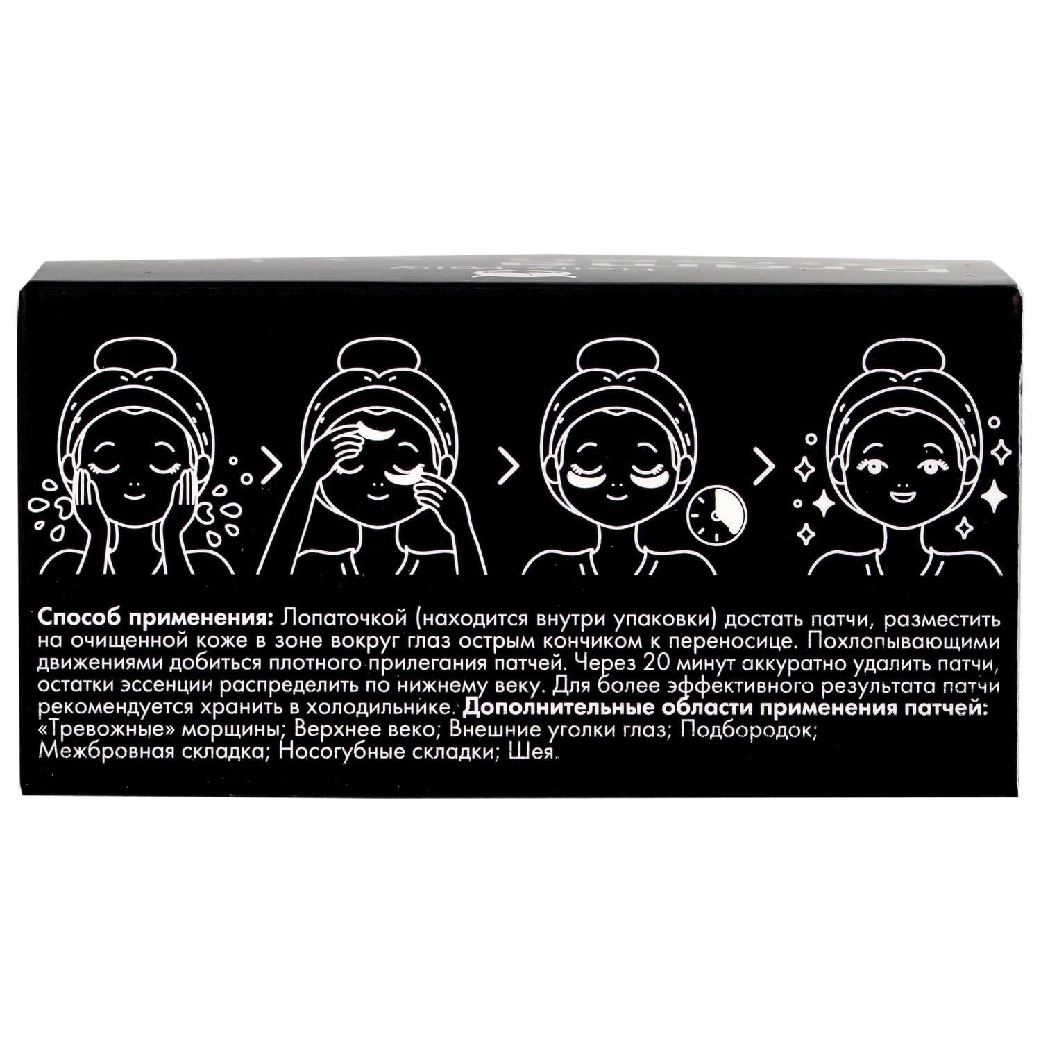 Дополнительные области применения патчей - тревожные» морщины: верхнее веко, внешние уголки глаз, межбровная складка, носогубные складки, подбородок, шея.