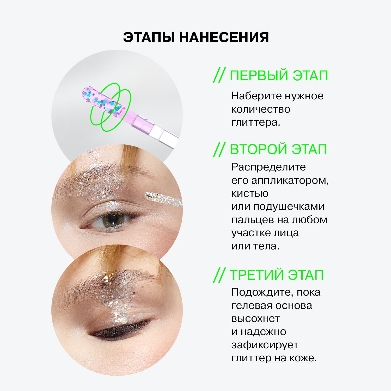 Наносите аппликатором, кистью или подушечками пальцев на любой участок лица или тела.