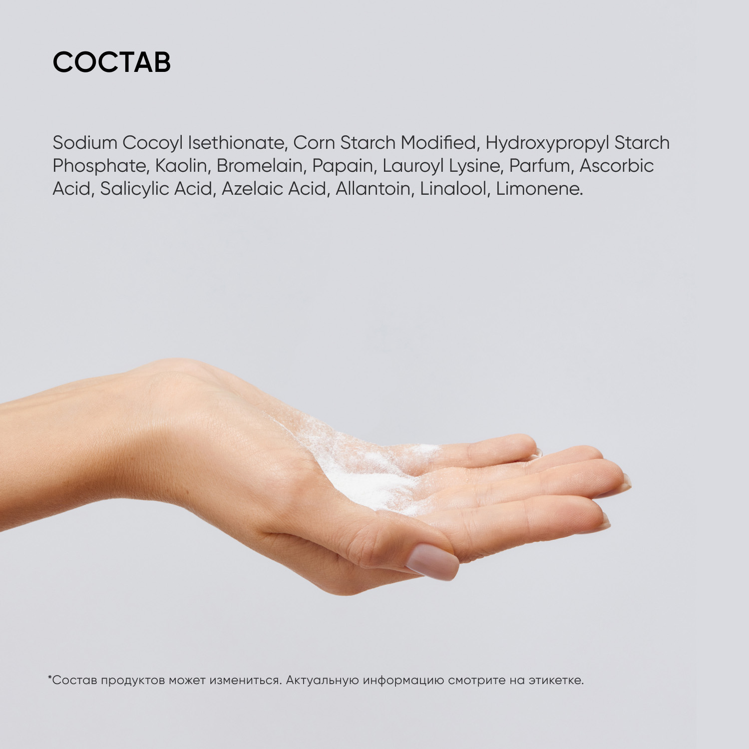 Состав: hydroxypropyl starch phosphate, sodium cocoyl isethionate, kaolin, ascorbic acid, bromelain, papain, lauroyl lysine, salicylic acid, parfum