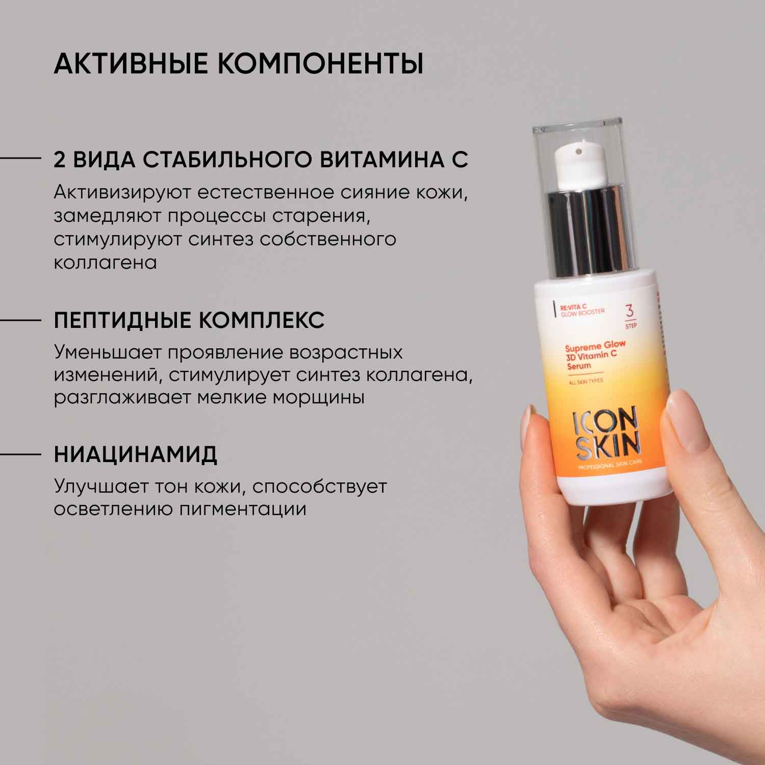 Сыворотка с 3D витамином С – насыщенный антиоксидантами витаминный коктейль, заряжающий кожу энергией и сиянием. Благодаря 3 видам витамина С и пептидам сыворотка выравнивает и улучшает цвет лица, дарит коже яркость и здоровое сияние, стирает признаки усталости, предотвращает преждевременное старение кожи. 2 формы стабильного витамина С борются с окислительным стрессом, стимулируют синтез коллагена и выравнивают тон кожи. Экстракт австралийской сливы, богатейший природный источник витамина С, усиливает сияние (+30%) и яркость кожи. Уменьшает выраженность морщин.