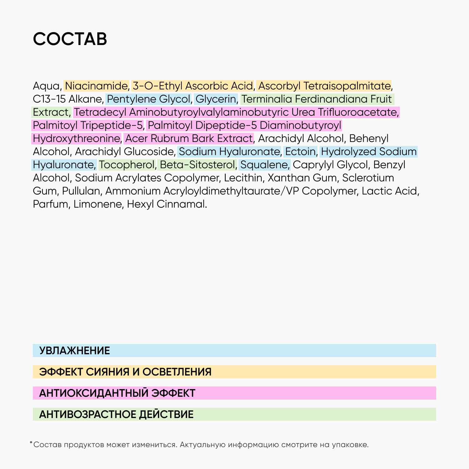 Состав: aqua, niacinamide, 3-o-ethyl ascorbic acid, ascorbyl tetraisopalmitate, c13-15 alkane, pentylene glycol, glycerin, terminalia ferdinandiana fruit extract, tetradecyl aminobutyroylvalylaminobutyric urea trifluoroacetate, palmitoyl tripeptide-5, palmitoyl dipeptide-5 diaminobutyroyl hydroxythreonine, acer rubrum extract, arachidyl alcohol, behenyl alcohol, arachidyl glucoside, sodium hyaluronate, ectoin, tocopherol (mixed), beta sitosterol, squalene, caprylyl glycol, benzyl alcohol, sodium acrylates copolymer, lecithin, lactic acid, parfum, d-limonene, butylphenyl methylpropional, hexyl cinnamal
