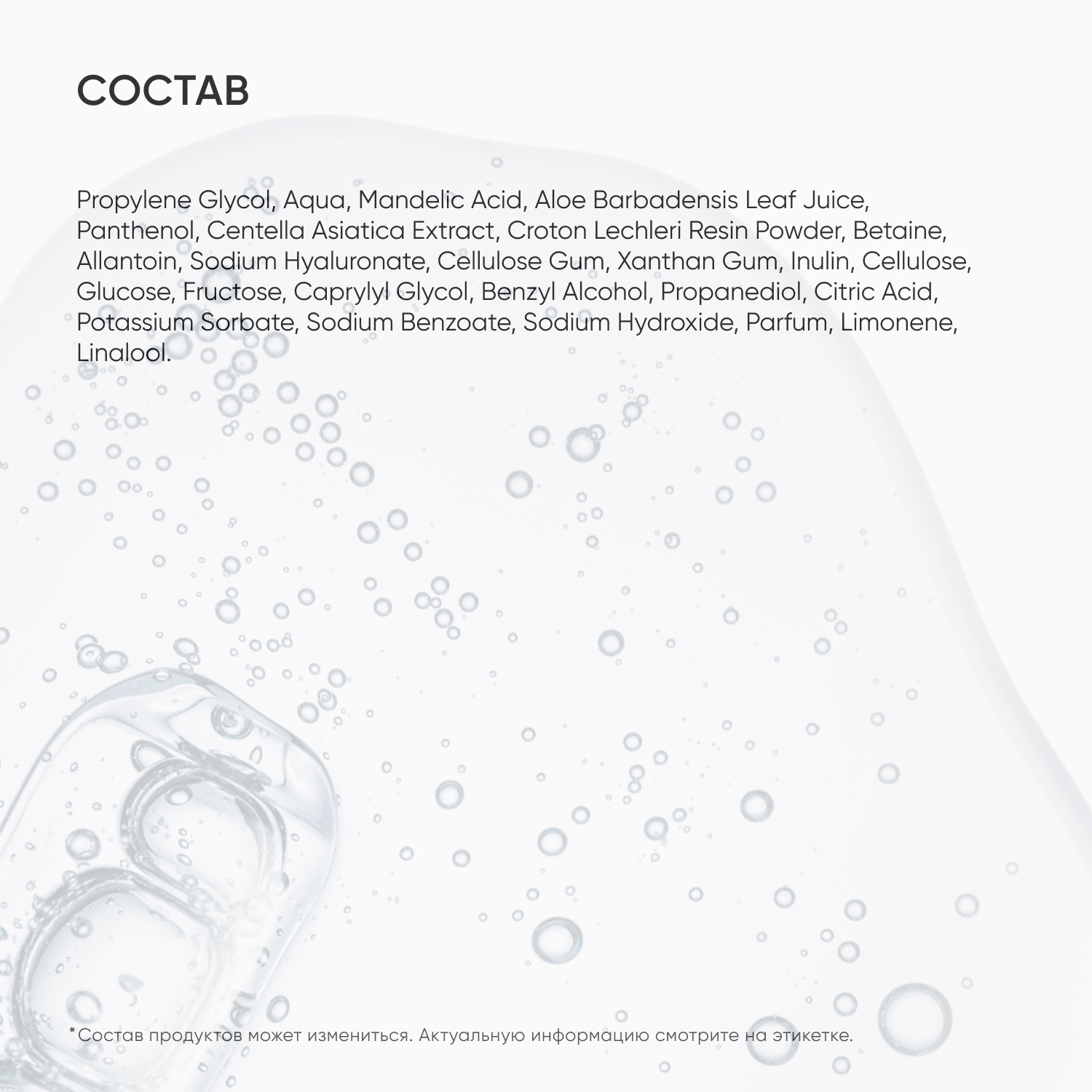 Состав: propylene glycol, aqua, mandelic acid, aloe barbadensis leaf juice, panthenol, centella asiatica extract, croton lechleri resin powder, betaine, allantoin, sodium hyaluronate, cellulose gum, xanthan gum, inulin, cellulose, glucose, fructose, caprylyl glycol, benzyl alcohol, propanediol, citric acid, potassium sorbate, sodium benzoate, sodium hydroxide, parfum, limonene, linalool.