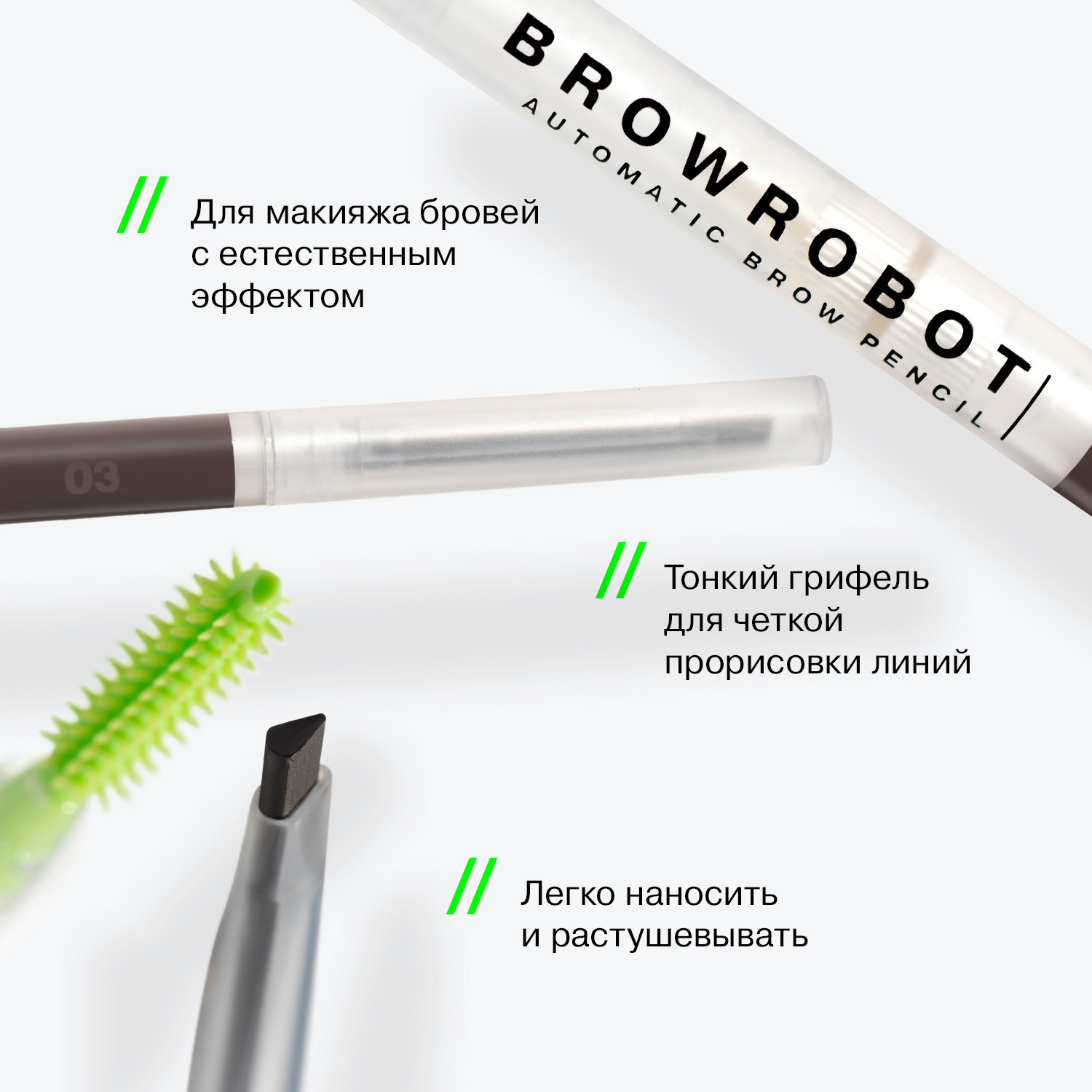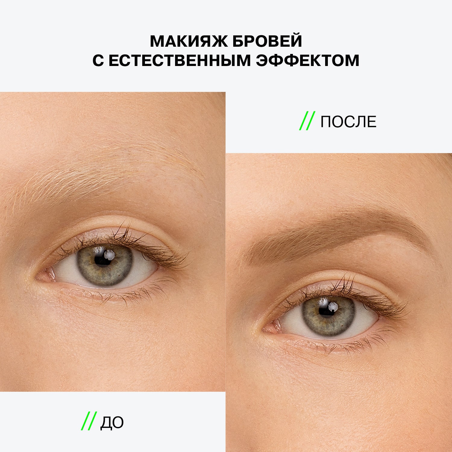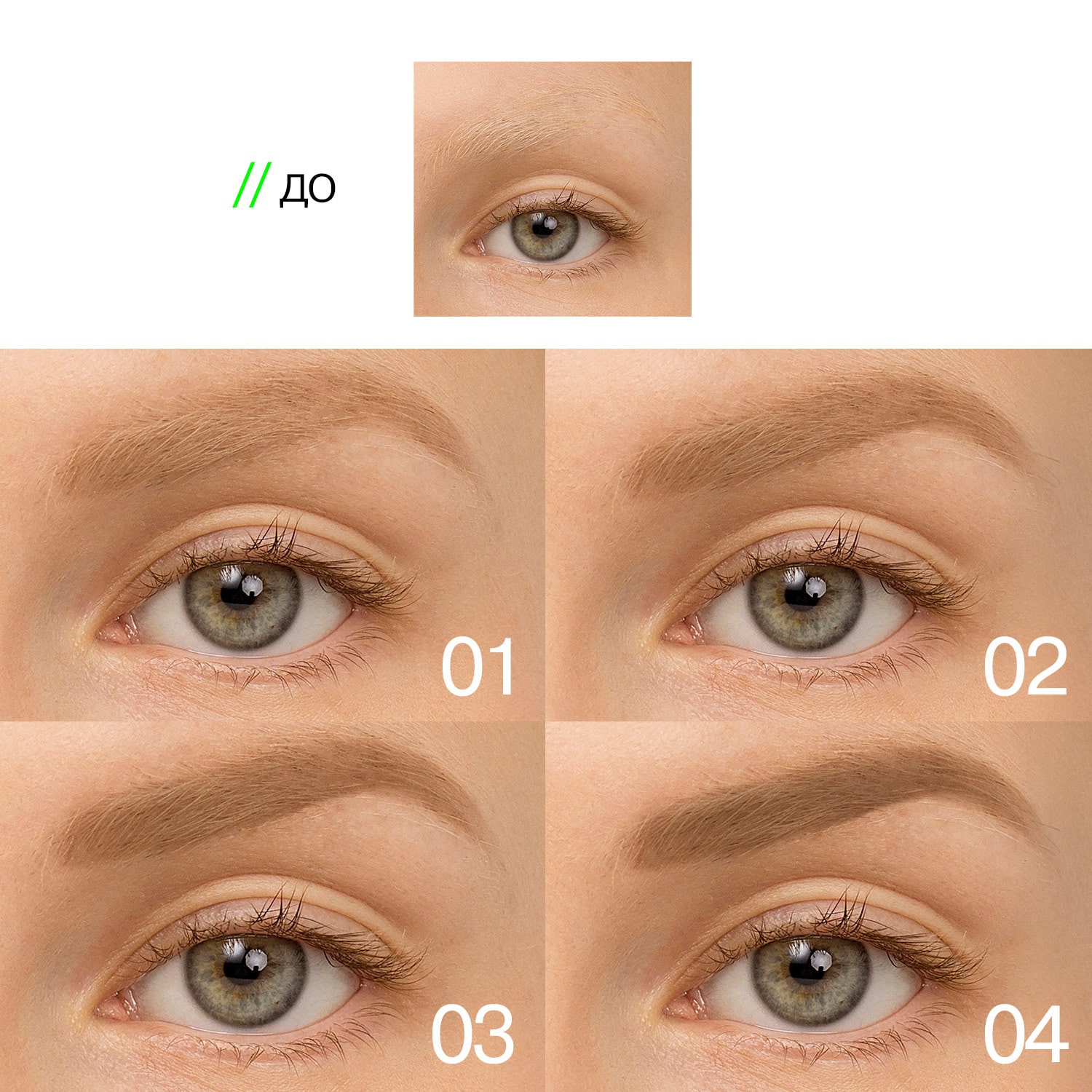 Благодаря треугольной форме грифеля, можно прорисовать отдельные волоски или полностью заштриховать участки, где это необходимо. Для более объемного эффекта используйте два оттенка карандаша Brow Robot.