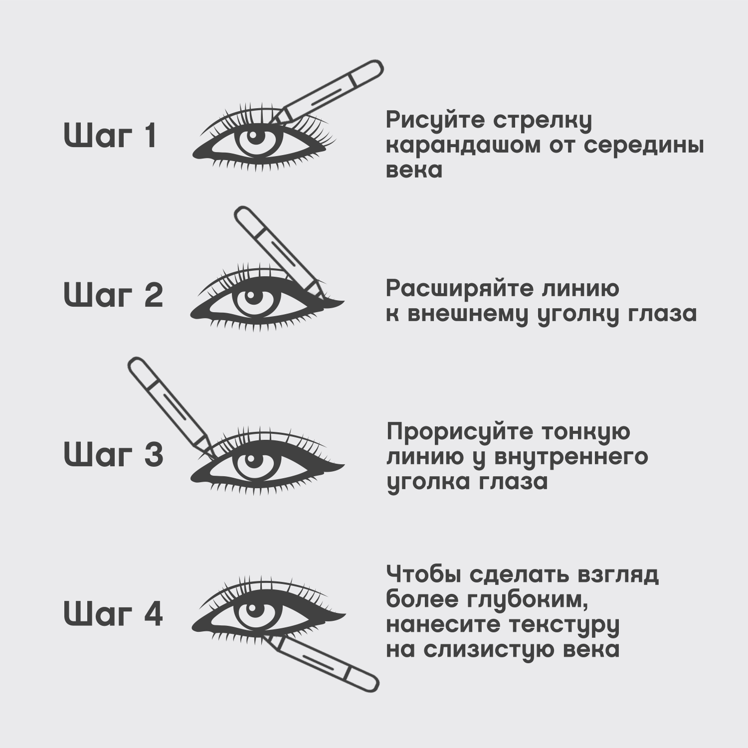Начните рисовать стрелку с середины века, постепенно расширяя линию ближе к внешнему краю глаза. После переходите к прорисовке внутреннего уголка верхнего века. Чтобы сделать взгляд более глубоким и подчеркнуть цвет глаз, заполните межресничное пространство и нанести текстуру на слизистую века.