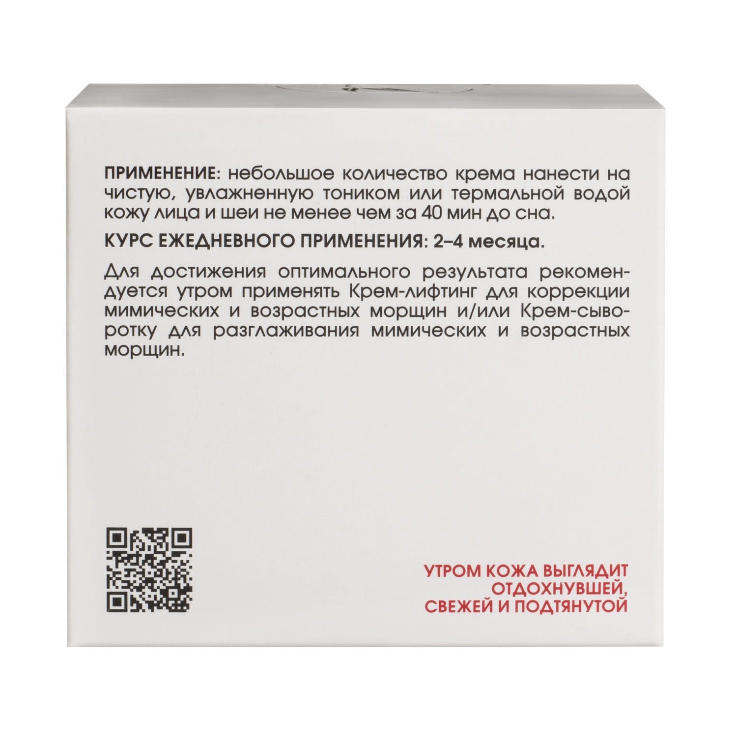 Предназначен для вечернего ухода за кожей. Рекомендуется с 40-45 лет. Небольшое количество крема легкими массажными движениями нанести на чистую, увлажненную тоником кожу лица и шеи за 30–40 мин до сна. Наиболее эффективен в сочетании с Крем-сывороткой для разглаживания морщин. Курс применения от 2 до 4 месяцев