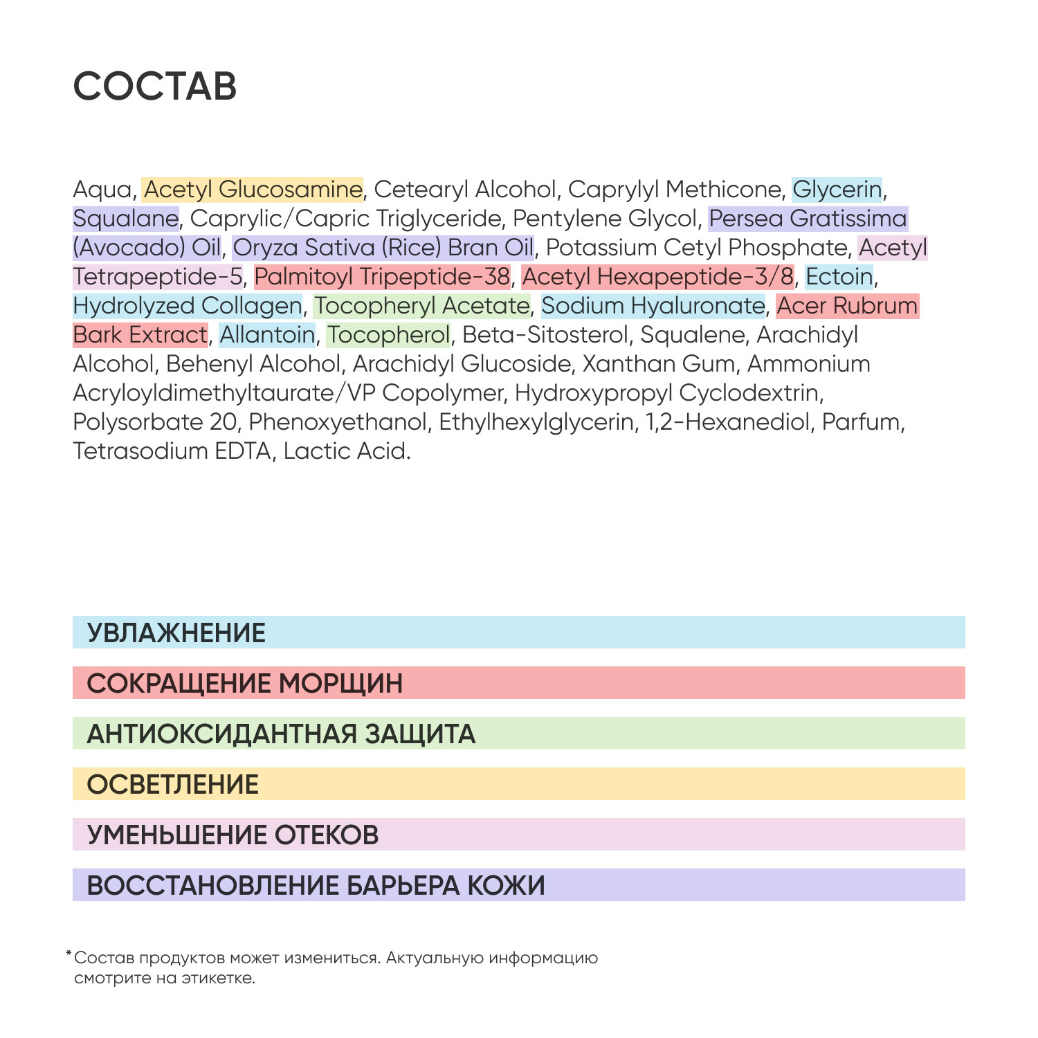 Состав: aqua, acetyl glucosamine, cetearyl alcohol, caprylyl methicone, glycerin, squalane, caprylic/capric triglyceride, pentylene glycol, persea gratissima (avocado) oil, oryza sativa (rice) bran oil, potassium cetyl phosphate, acetyl tetrapeptide-5, palmitoyl tripeptide-38, acetyl hexapeptide-3/8, ectoin, hydrolyzed collagen, tocopheryl acetate, sodium hyaluronate, acer rubrum bark extract, allantoin, tocopherol, beta-sitosterol, squalene, arachidyl alcohol, behenyl alcohol, arachidyl glucoside, xanthan gum, ammonium acryloyldimethyltaurate/vp copolymer, hydroxypropyl cyclodextrin, polysorbate 20, phenoxyethanol, ethylhexylglycerin, 1,2-hexanediol, parfum, disodium edta, lactic аcid