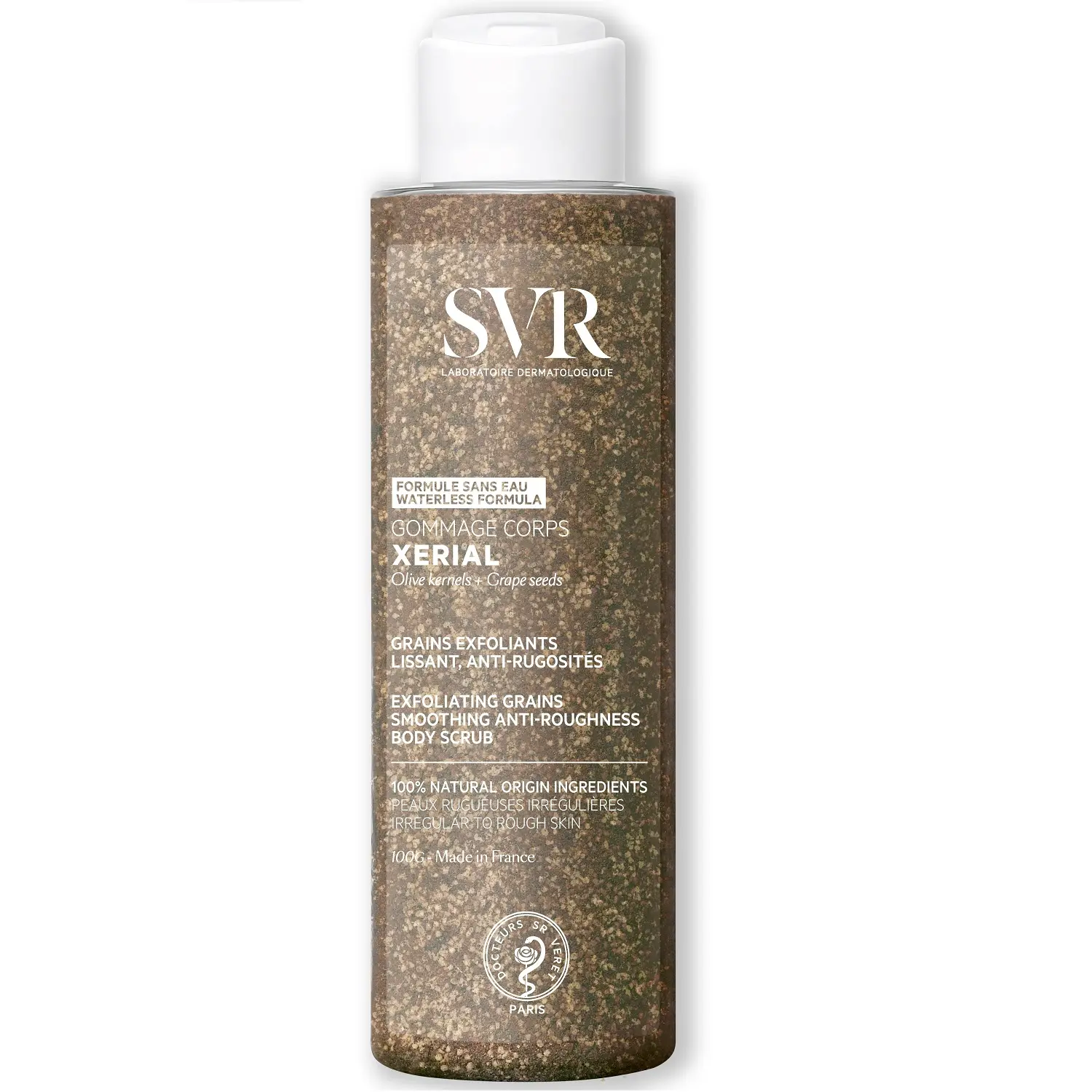 SVR Xerial Gommage Corps — скраб для тела, изготовленный исключительно из оливковых и виноградных косточек разного размера, обеспечивающий эффективное отшелушивание, не вызывая боли. Механическое воздействие эффективно удаляет омертвевшие клетки, шероховатости и шелушения. Текстура кожи улучшается, она становится гладкой, мягкой и сияющей.
