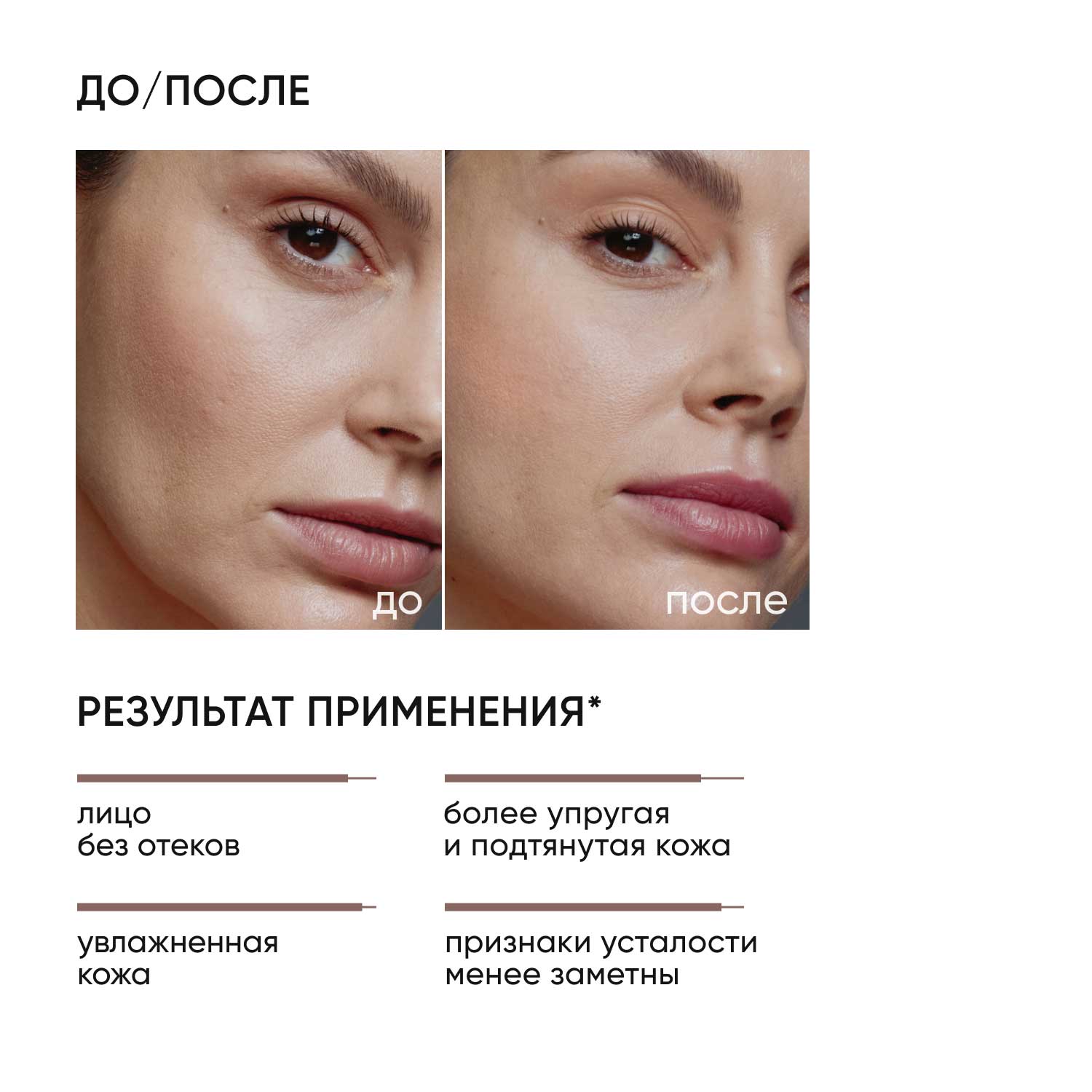 Результат применения: свежий цвет лица, менее выраженная отечность.