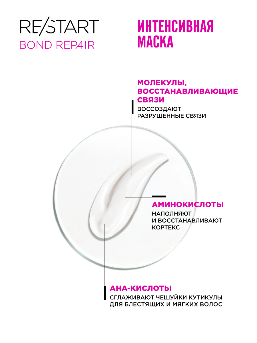 Активы: молекулы, восстанавливающие связи, омега-9 и AHA-кислоты. Не содержит силиконы.