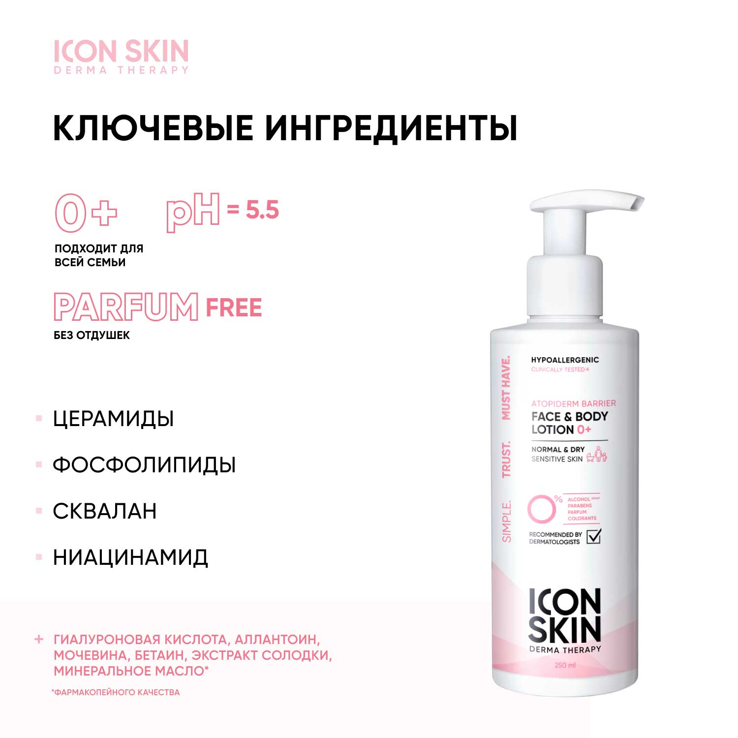 Формула средства гипоаллергенна и одобрена дерматологами. Не содержит красителей, спирта, отдушек и парабенов. Лосьон рекомендован для нормальной и сухой кожи, а также чувствительной и склонной к атопии.