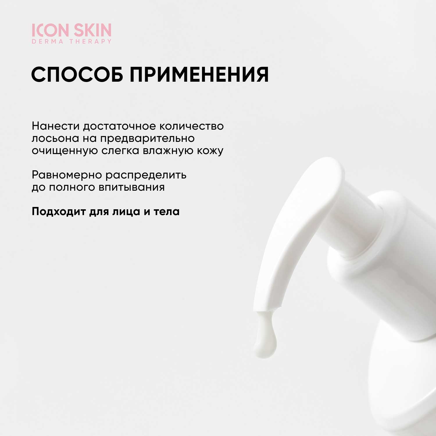 Нанести достаточное количество лосьона на предварительно очищенную слегка влажную кожу. Равномерно распределить до полного впитывания. Подходит для лица и тела.