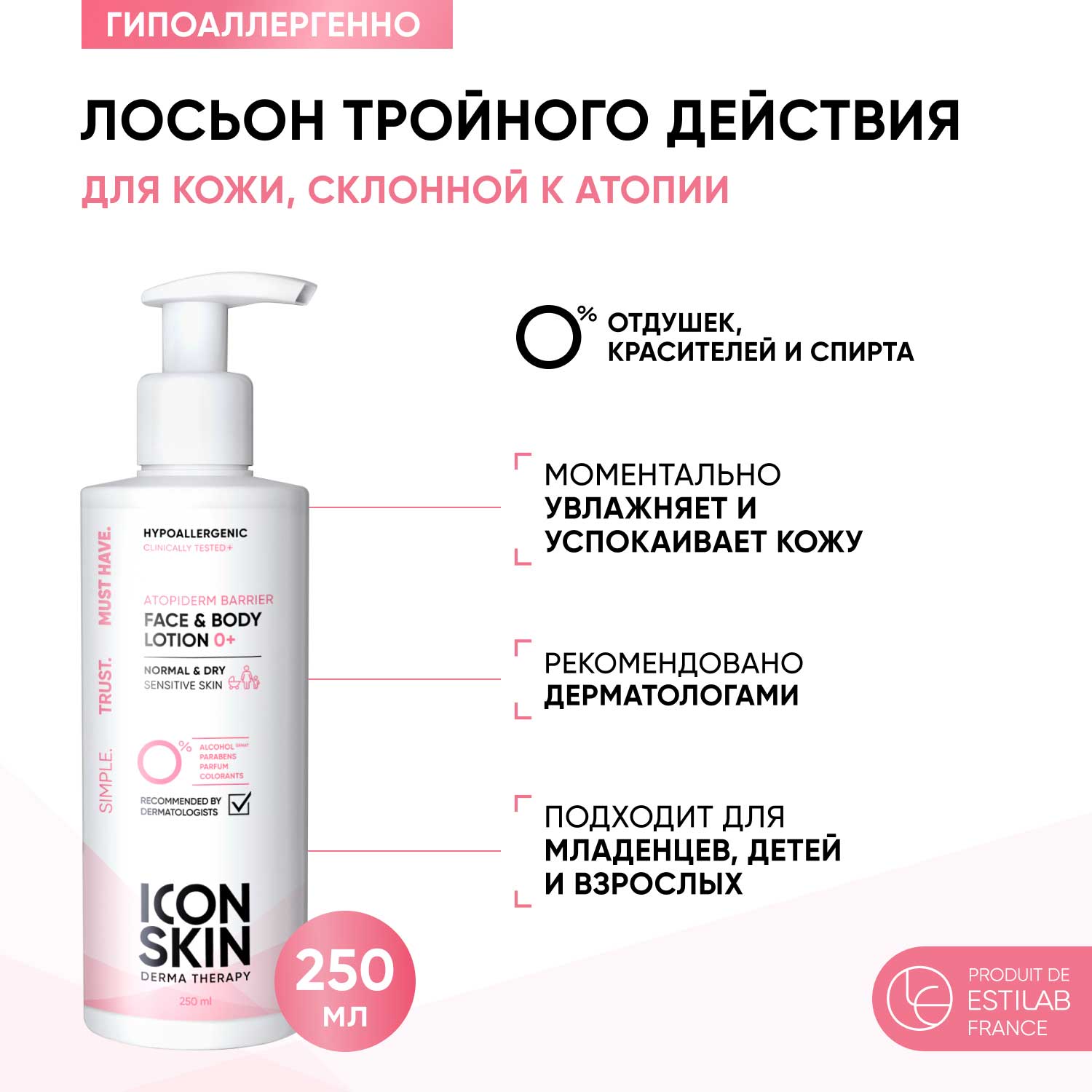 Убирает покраснения, раздражения и возвращает чувство комфорта с первого нанесения. При регулярном применении снижает признаки атопии - обеспечивает бережный уход для устранения зуда, заживления, увлажнения и защиты. Надолго снимает неприятные ощущения, кожа меньше теряет влагу и лучше защищена от воздействия факторов окружающей среды. Легкая текстура лосьона не утяжеляет и не оставляет липкости, легко распределяется и быстро впитывается.
