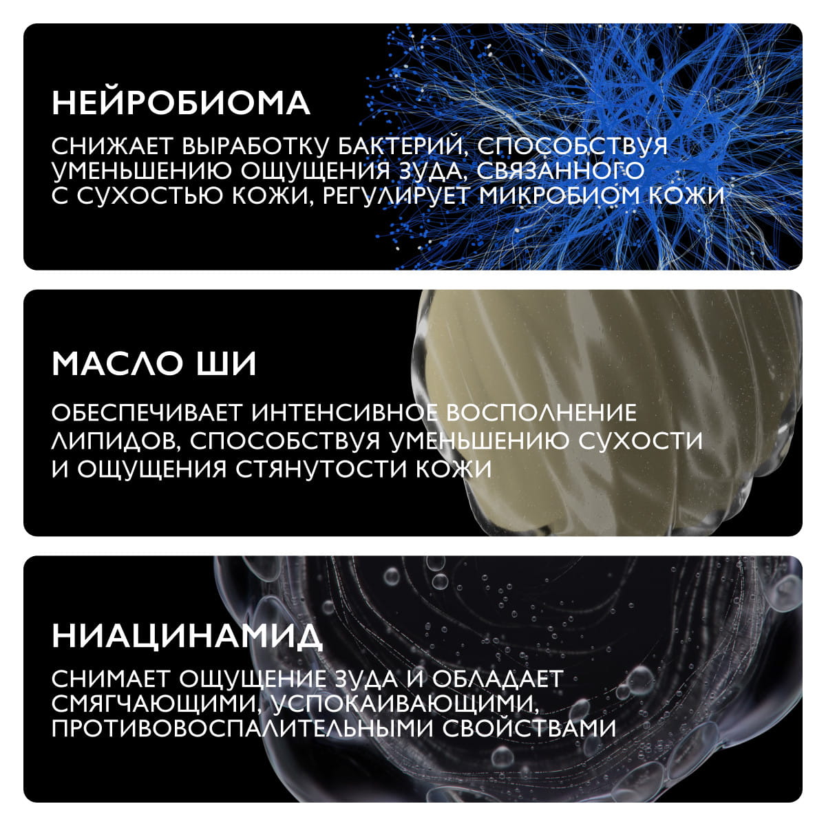 Комплекс ингредиентов, в состав которого входит нейробиома, помогает уменьшить зуд, вызванный сухостью кожи. Средство мгновенно успокаивает и заметно продлевает ремиссию.