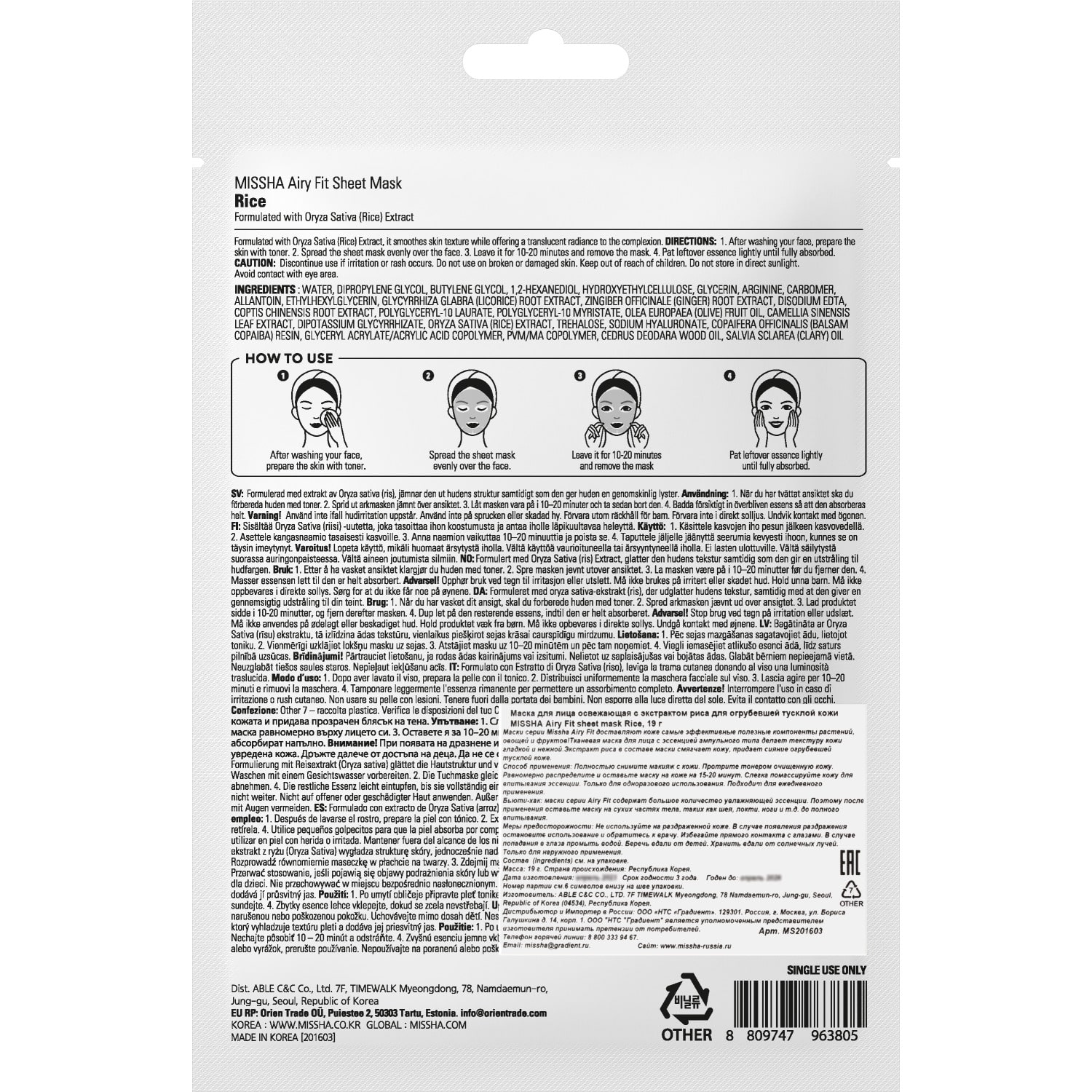 Бьюти-хак: маски серии Airy Fit содержат большое количество увлажняющей эссенции. Поэтому после применения оставьте маску на сухих частях тела, таких как шея, локти, ноги и т.д. до полного впитывания.