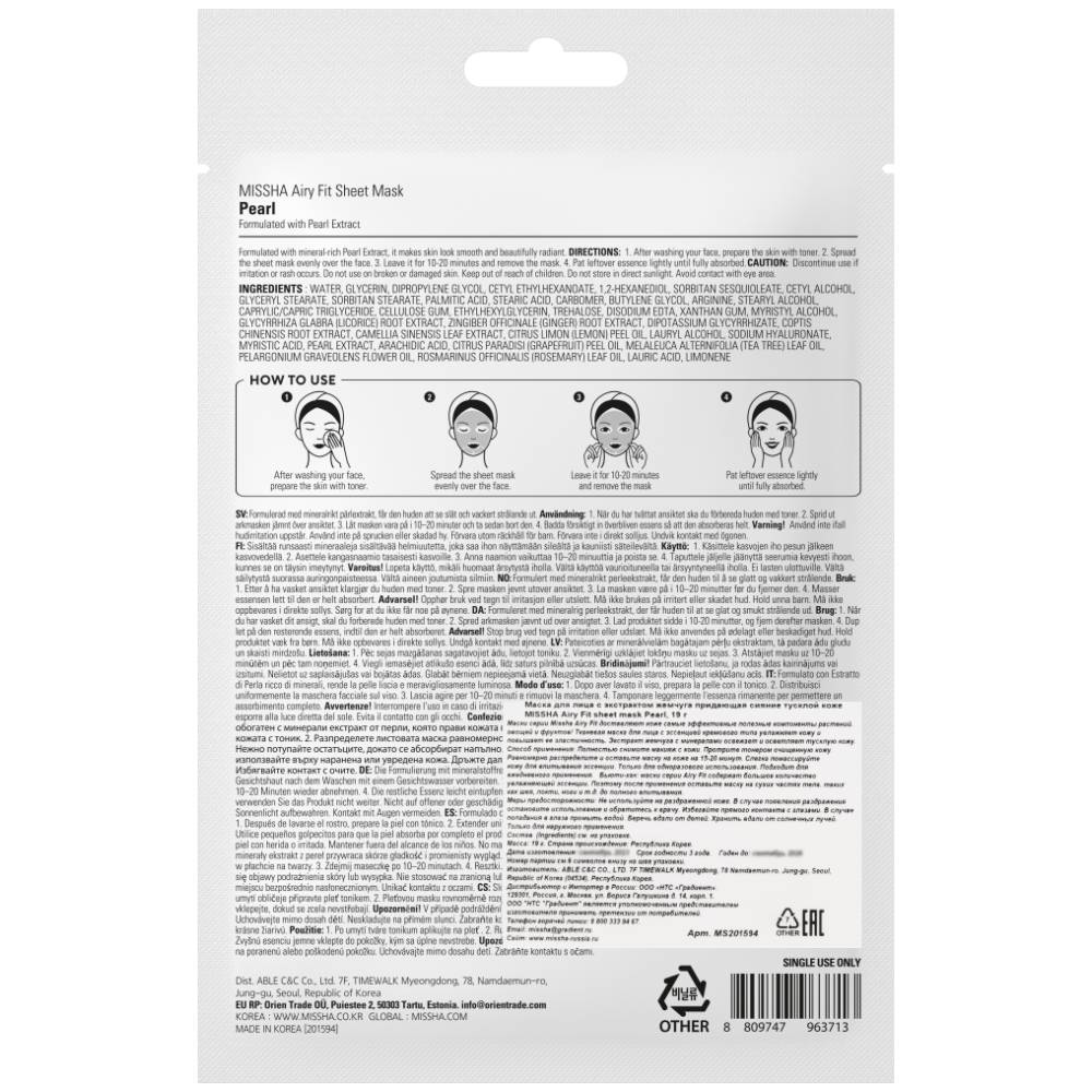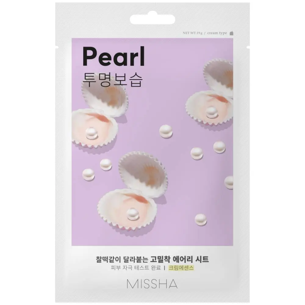 Одноразовая тканевая маска с экстрактом жемчуга Missha Airy Fit Sheet Mask Pearl интенсивно увлажняет, освежает и придаёт сияние тусклой коже. Маска пропитана эссенцией кремового типа.