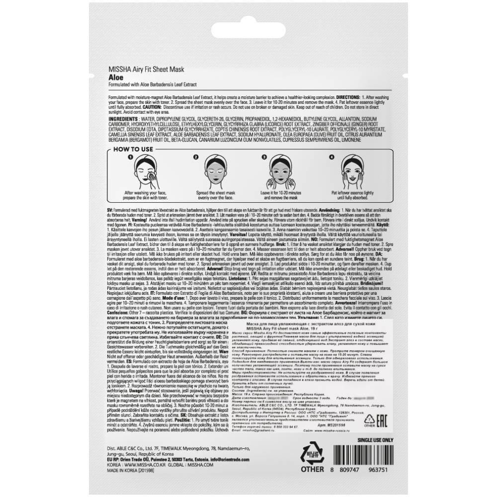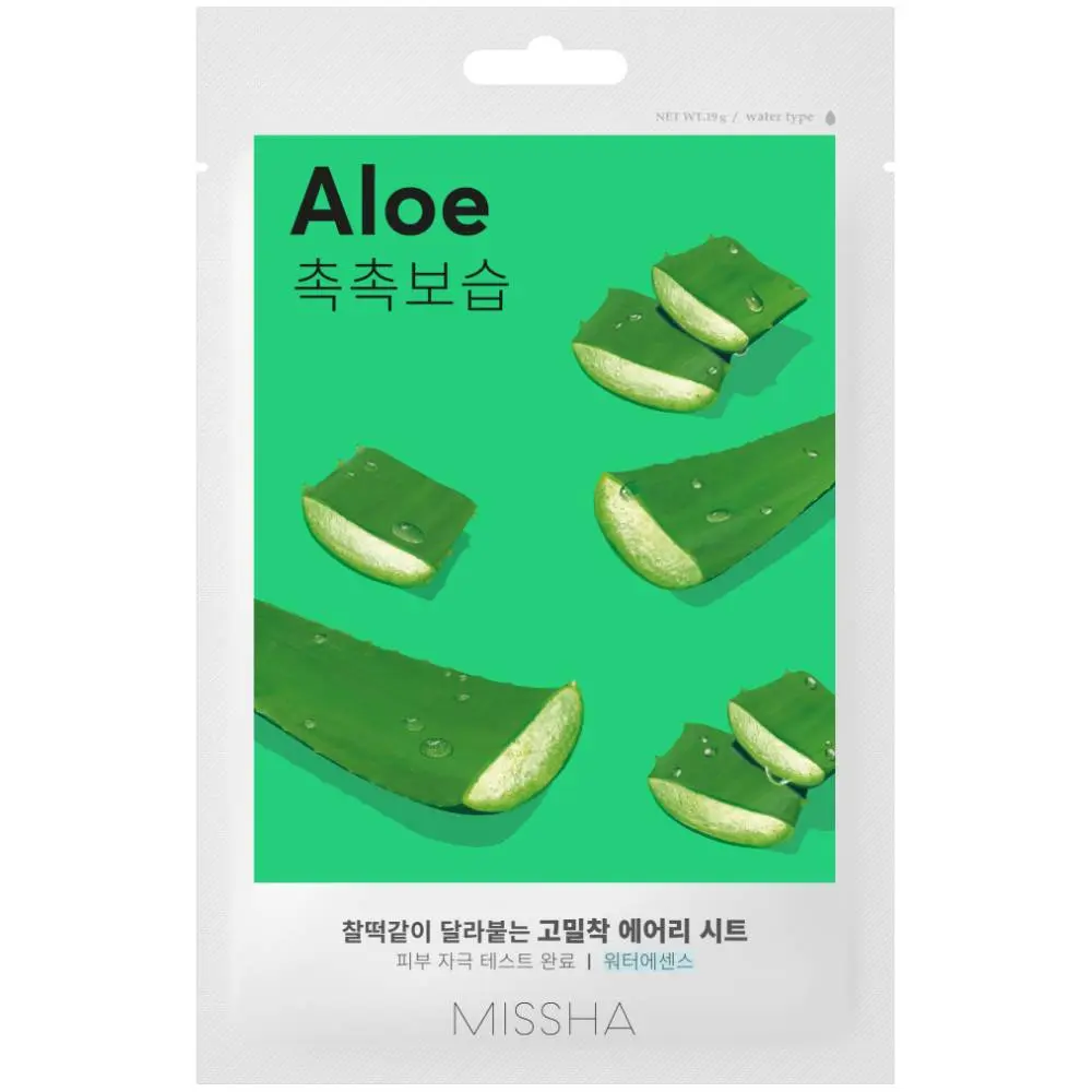 Одноразовая тканевая маска с экстрактом алоэ Missha Airy Fit Sheet Mask Aloe интенсивно увлажняет, освежает и восстанавливает сухую и обезвоженную кожу. Идеальна для восстановления кожи после активного солнца и пребывания в кондиционированном и сильно отапливаемом помещении. Маска пропитана ультралёгкой водной эссенцией.