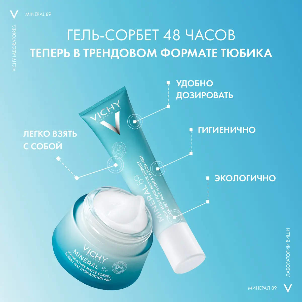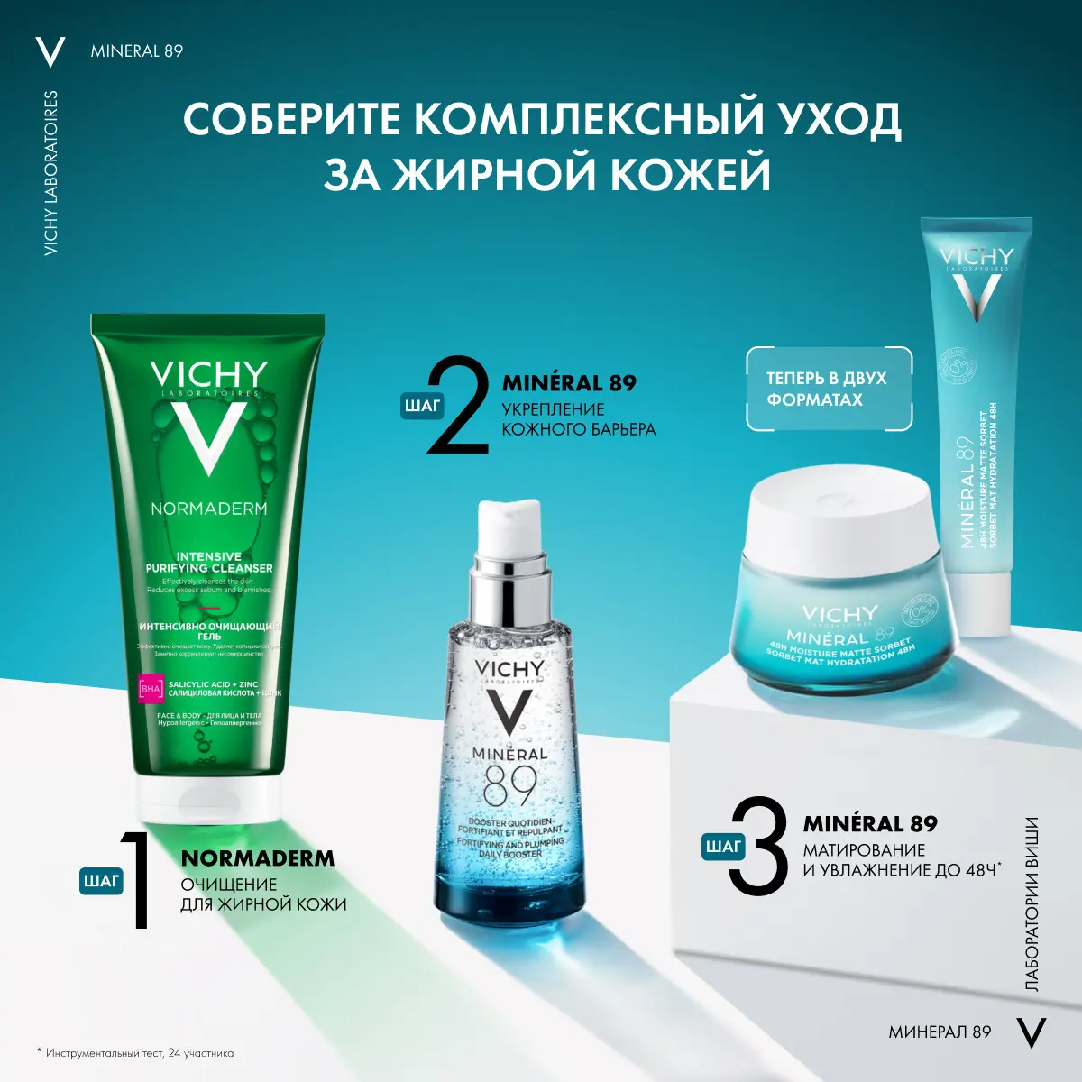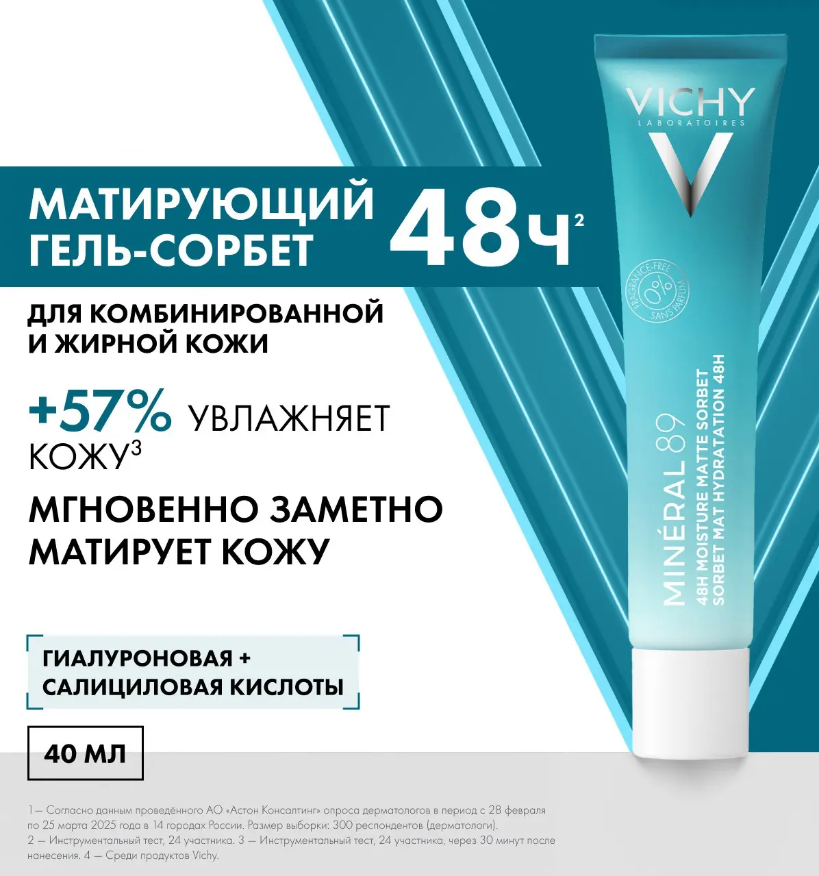 Впервые* лаборатории Vichy объединили необходимые для кожи компоненты в одной формуле. Освежающий матирующий гель для лица обеспечивает видимый контроль жирности в течение дня. Кожа мгновенно становится матовой, поры заметно сужаются. Применяется как увлажняющий сорбет для лица с проблемной кожей.