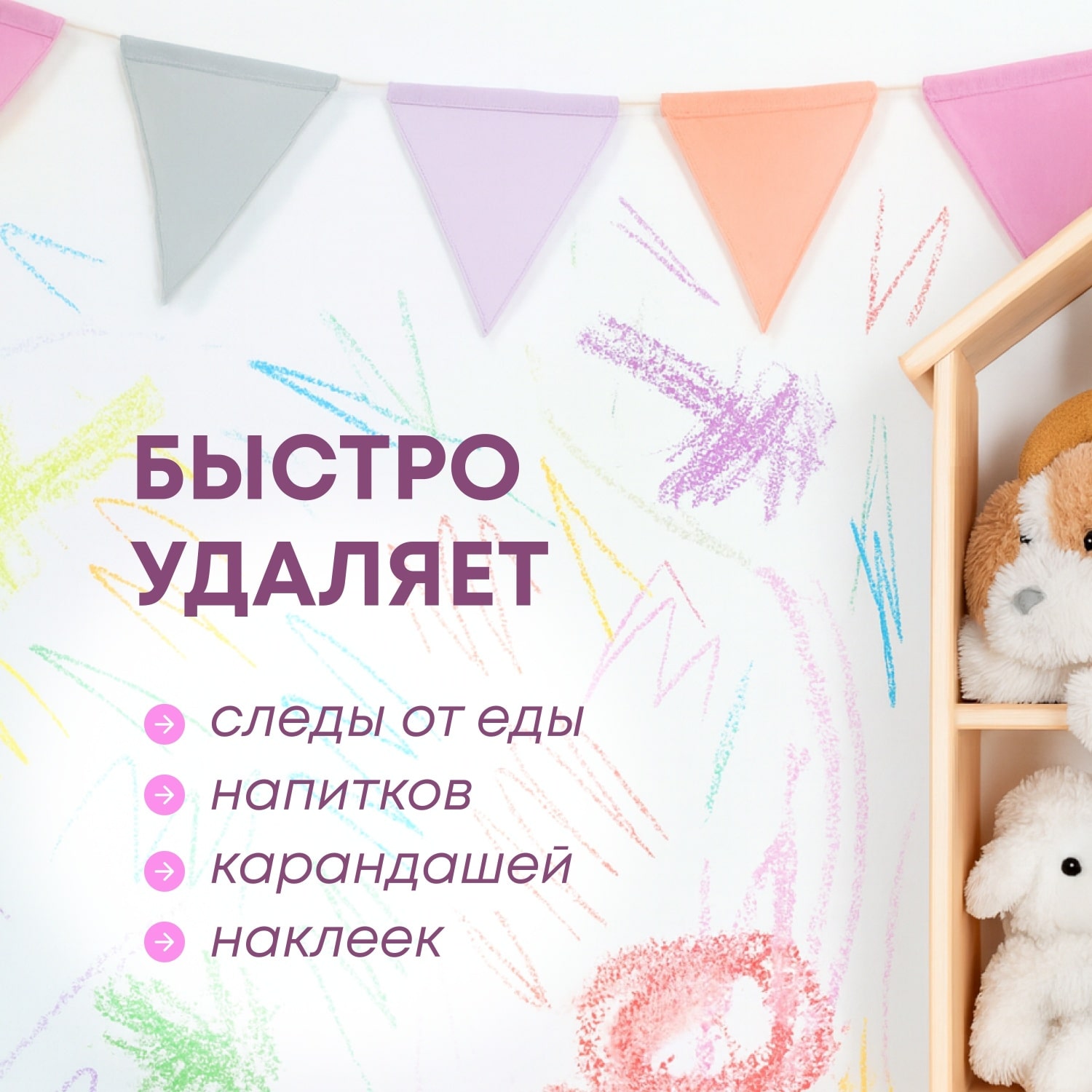 Подходит для уборки всех поверхностей в детских комнатах, протирки игрушек и мебели. Эффективно удаляет органические загрязнения от молока, фруктовых и овощных пюре, соков, а также следы от фломастеров, карандашей, наклеек и другие бытовые загрязнения.
