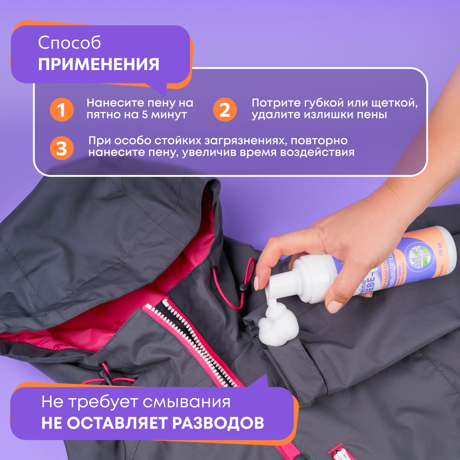 Предназначена для очищения верхней одежды, кожи, нубука и домашнего текстиля. Также рекомендована к использованию для очищения галстуков, лацканов и рукавов пиджаков. Не повреждает ткань, сохраняет цвет, не оставляет разводов. Забота о долговечности изделий, так как можно локально очищать загрязнения, не сдавая вещи в химчистку. Безопаснее, чем стирка в машинках (так как не деформируются наполнители в одежде)