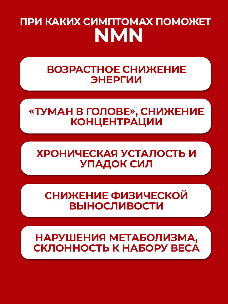 Никотинамидмононуклеотид (NMN) является эффективным предшественником основного метаболита витамина В3, NAD+. Уровни NAD+ снижаются с возрастом и высоким потреблением калорий, что может поставить под угрозу функцию митохондрий. NAD+ является необходимым кофактором для сиртуинов и ферментов, которые способствуют здоровому старению, регулируя экспрессию генов, восстановление ДНК, митохондриальный биогенез и энергетический метаболизм.