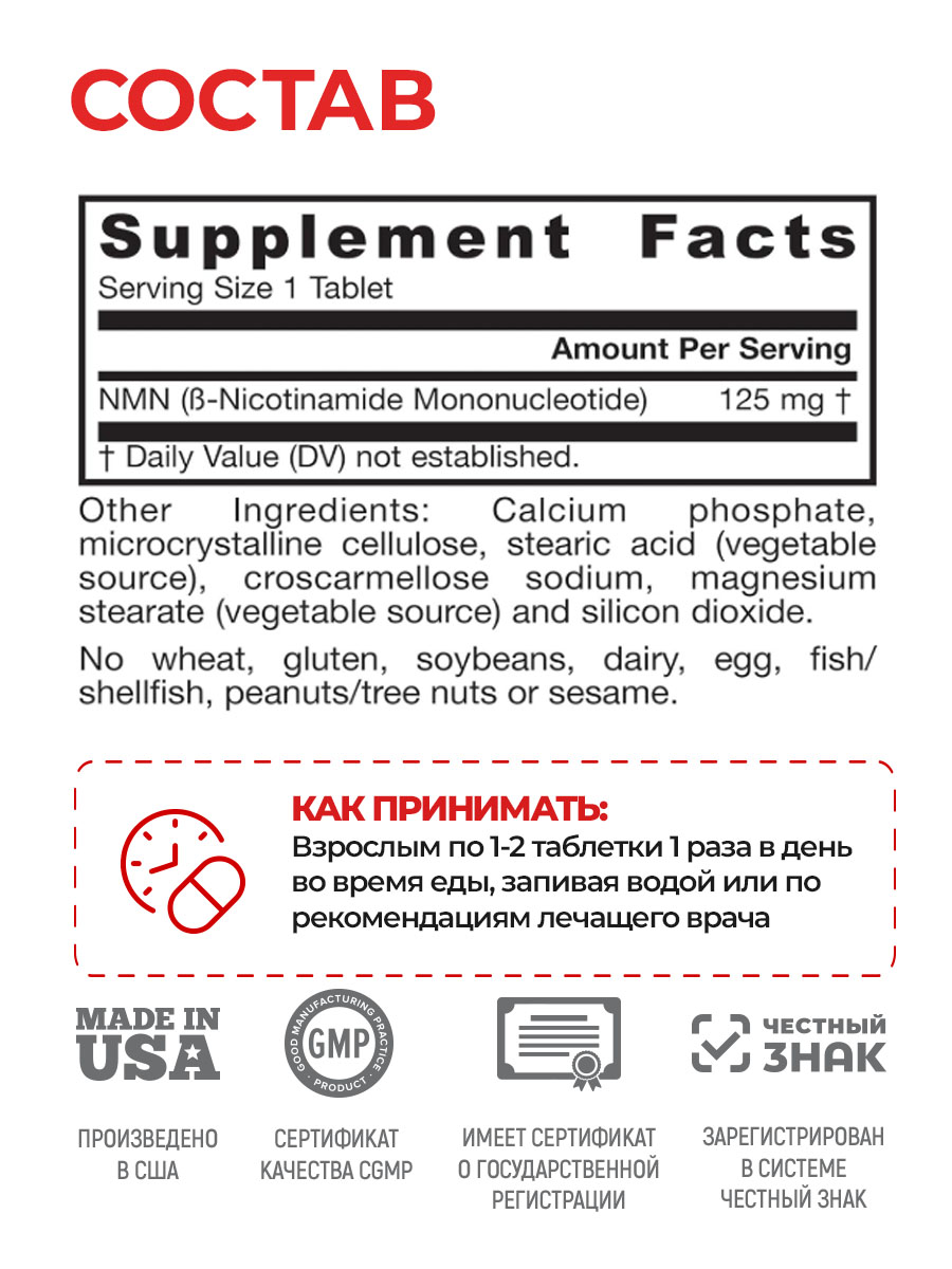 Состав: НМН (β-никотинамида мононуклеотид), фосфат кальция (разрыхлитель), целлюлоза (наполнитель), стеариновая кислота (растительного происхождения) (антислеживающий агент), стеарат магния (растительного происхождения) (лубрикант), диоксид кремния (наполнитель).