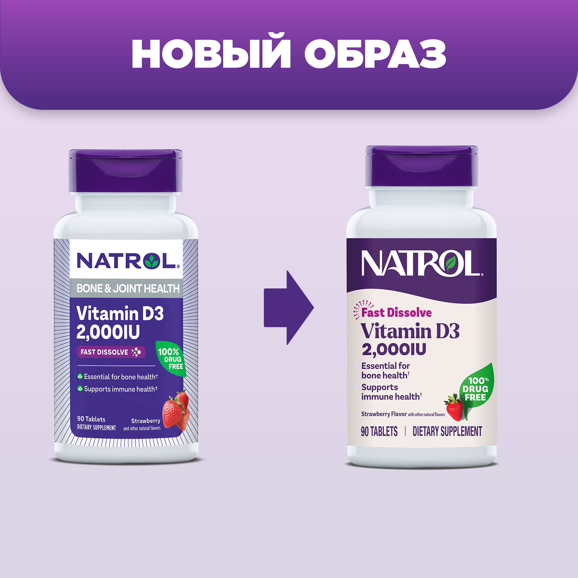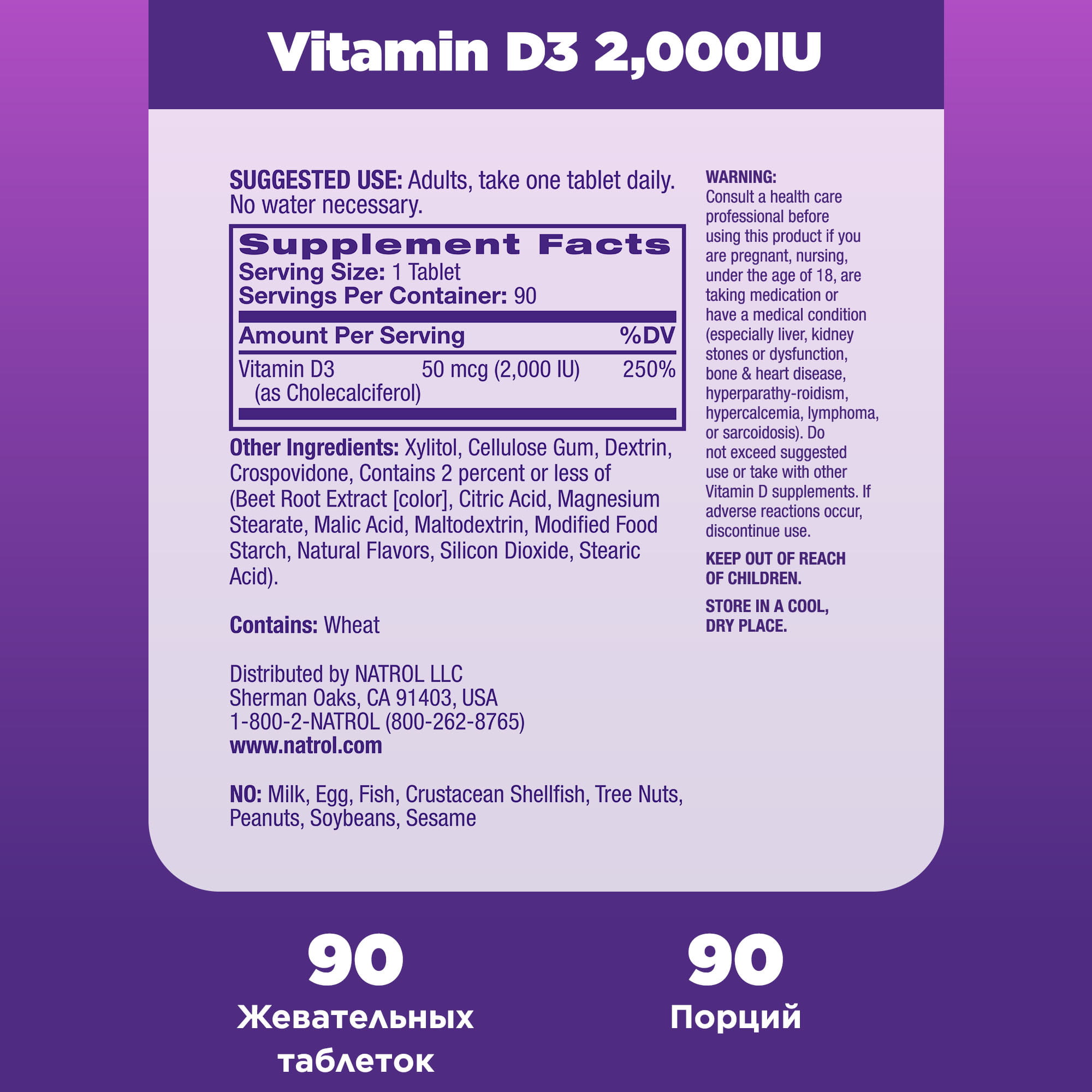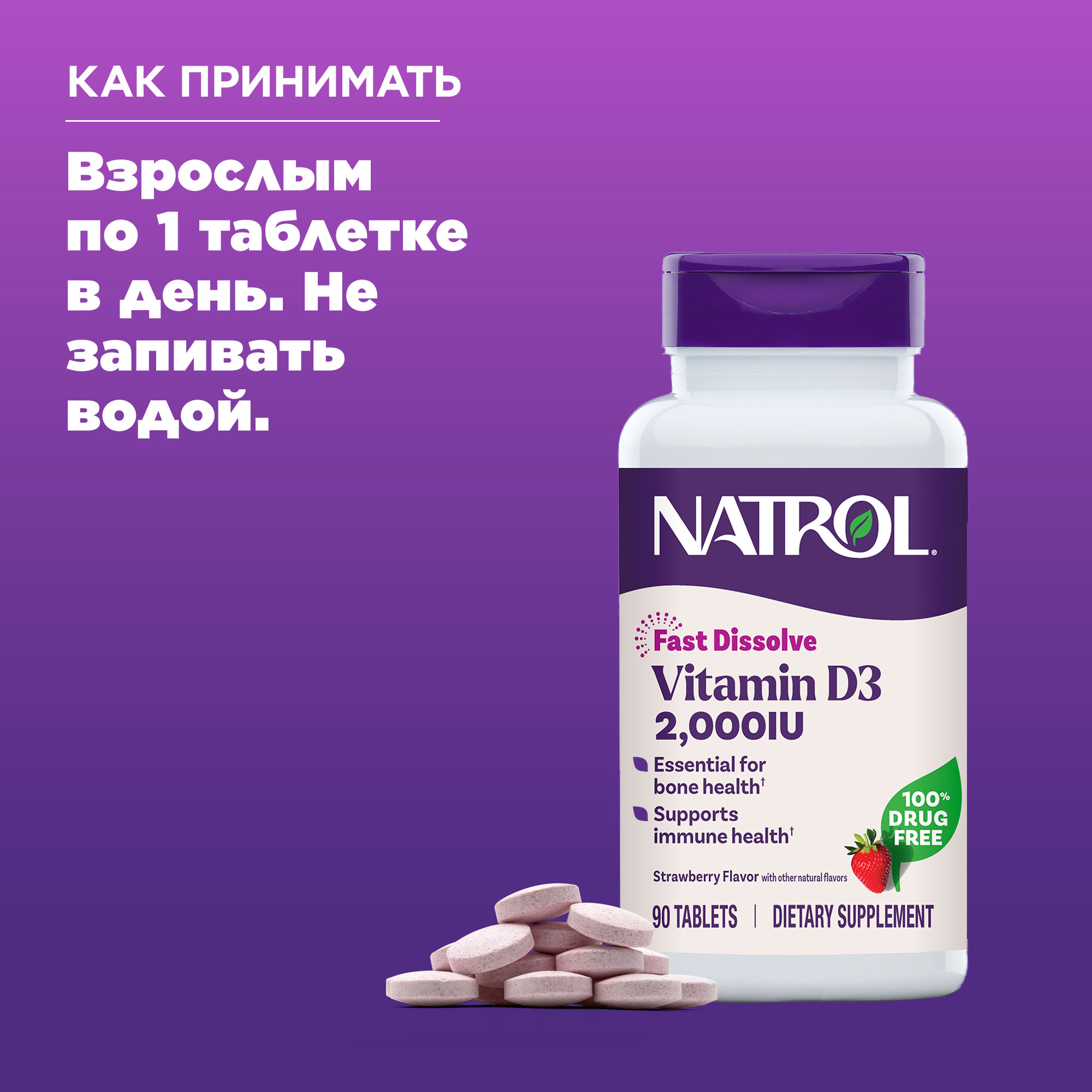 Состав: ксилит (подсластитель), витамин D3 (холекальциферол, целлюлозная камедь (загуститель), ПВП (Полиплаздон Кросповидон) (для быстрого распада), натуральный ароматизатор клубники (содержит мальтодекстрин и иодифицированный пищевой крахмал), порошок корня свеклы, диоксид кремния (антислеживающий агент), регулятор кислотности яблочная кислота, стеариновая кислота (эмульгатор), стеарат магния (эмульгатор), регулятор кислотности лимонная кислота.