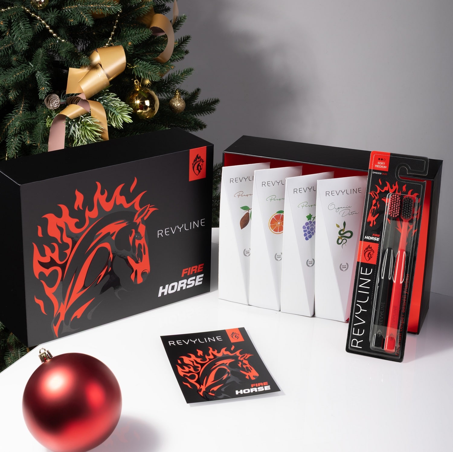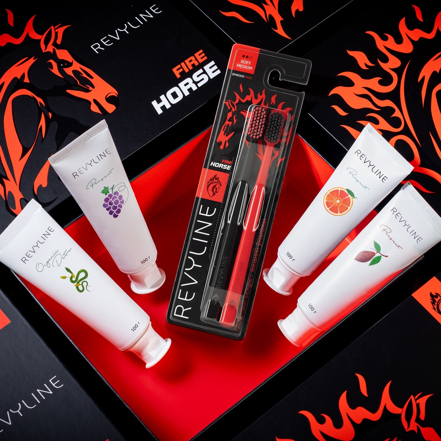 Подарочный набор Revyline № 1 Fire Horse – прекрасная возможность сделать полезный подарок родным, близким, друзьям, коллегам к зимним праздникам. Зубные щетки, подарочные пакет, коробка и открытка выпущены лимитированной серией специально к 2026 году – году Огненной Лошади.
