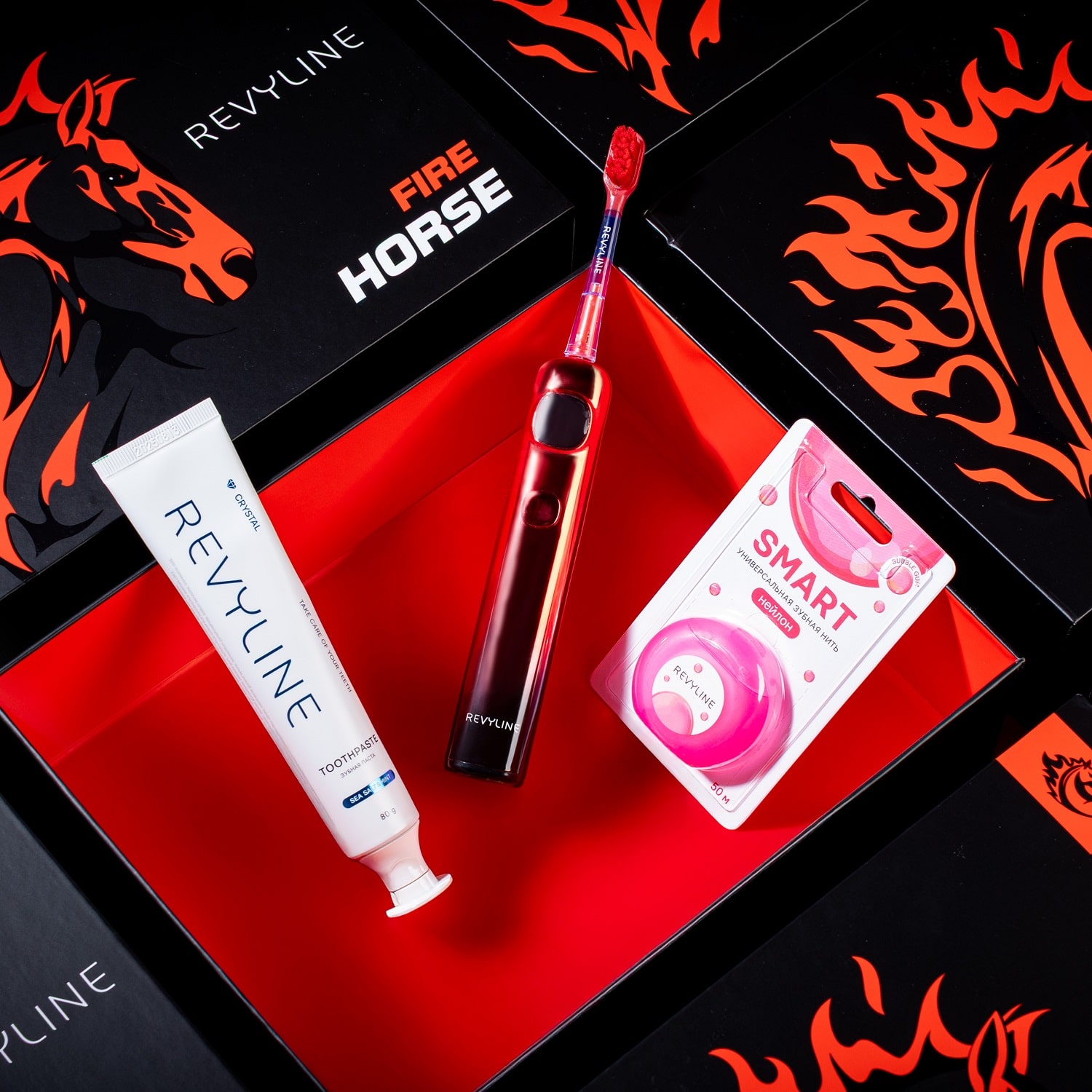 Подарочный набор Revyline № 2 Fire Horse – прекрасная возможность сделать полезный подарок родным, близким, друзьям, коллегам к зимним праздникам. Электрическая зубная щетка, подарочные пакет, коробка и открытка выпущены лимитированной серией специально к 2026 году – году Огненной Лошади.