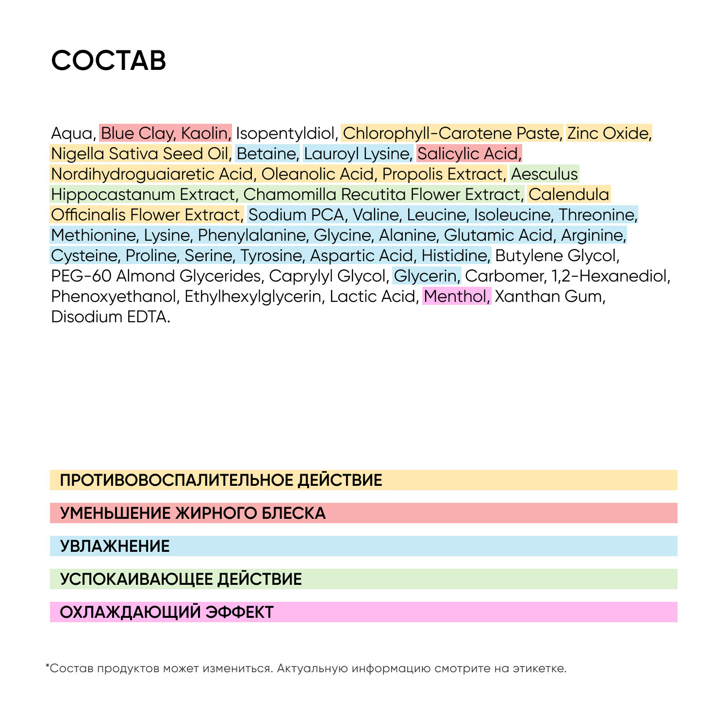 Состав: Aqua, Blue Clay, Kaolin, Isopentyldiol, Chlorophyll-Carotene Paste, Zinc Oxide, Nigella Sativa Seed Oil, Betaine, Lauroyl Lysine, Salicylic Acid, Nordihydroguaiaretic Acid, Oleanolic Acid, Propolis Extract, Aesculus Hippocastanum Extract, Chamomilla Recutita Flower Extract, Calendula Officinalis Flower Extract, Sodium PCA, Valine, Leucine, Isoleucine, Threonine, Methionine, Lysine, Phenylalanine, Glycine, Alanine, Glutamic Acid, Arginine, Cysteine, Proline, Serine, Tyrosine, Aspartic Acid, Histidine, Butylene Glycol, PEG-60 Almond Glycerides, Caprylyl Glycol, Glycerin, Carbomer, 1,2-Hexanediol, Phenoxyethanol, Ethylhexylglycerin, Lactic Acid, Menthol, Xanthan Gum, Disodium EDTA.