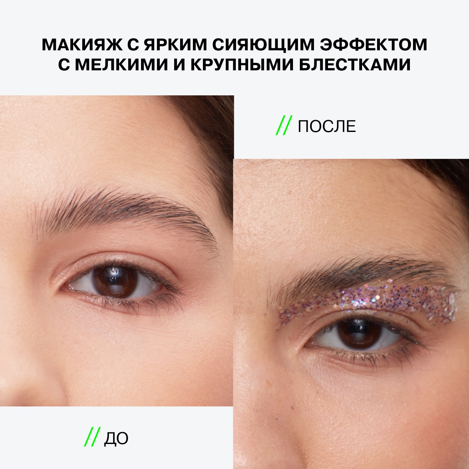 Слегка припудрите кожу, чтобы сделать ее матовой, прежде чем добавлять глиттер. Для более яркого завершения образа смешивайте разные цвета глиттеров из палетки Supernova. Время высыхания на коже зависит от плотности нанесения.