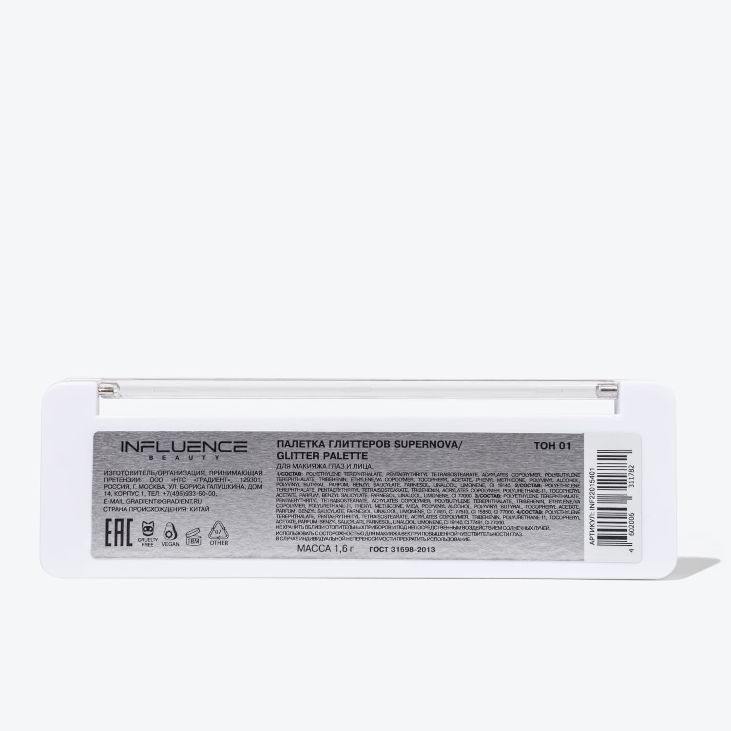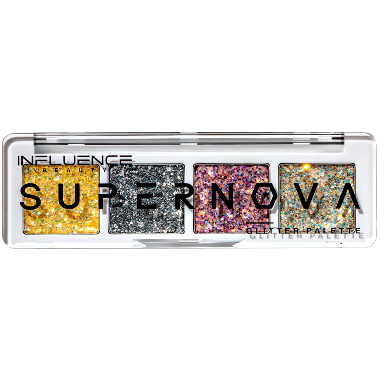 Палетка глиттеров Supernova от Influence Beauty на кремовой основе может использоваться для макияжа любой зоны лица и тела. Края каждой частицы глиттера обработаны по технологии Smooth Edge, что позволяет избежать механического повреждения кожи, появления воспалений и аллергических реакций. Желательно, чтобы цвет глиттера сочетался с цветом глаз, если речь идет о тенях.