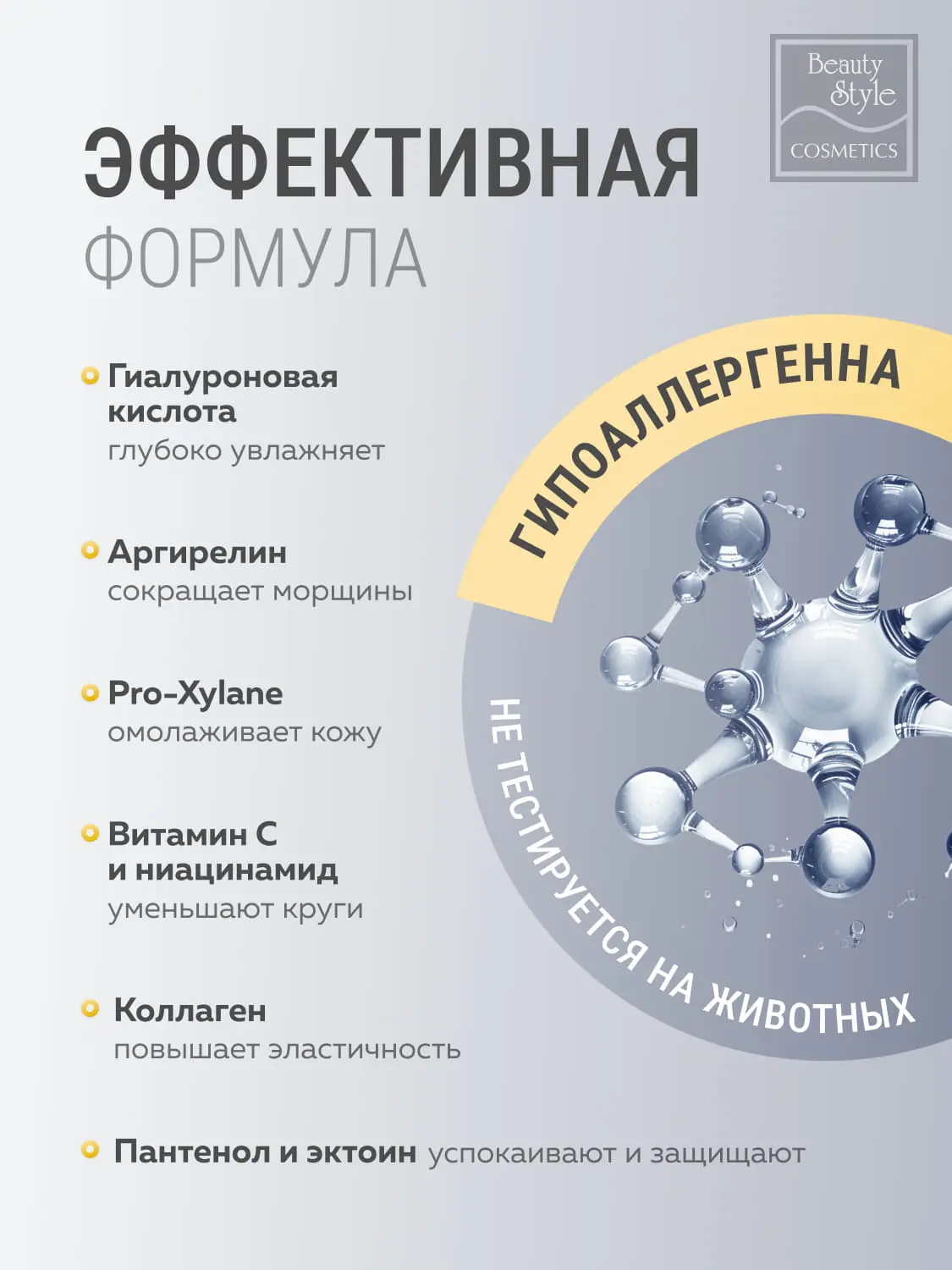 - ниацинамид — укрепляет стенки капилляров, уменьшает выраженность тёмных кругов, выравнивает тон