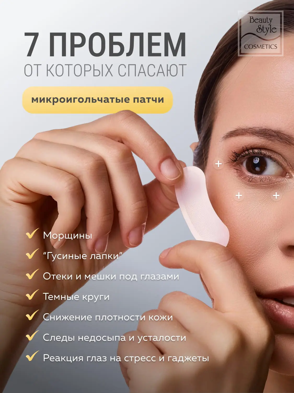 Расположите патчи под глазами. Микроиглы должны соприкасаться с кожей. Легко прижмите кончиками пальцев, чтобы обеспечить полный контакт. Не двигайте патчи после фиксации.