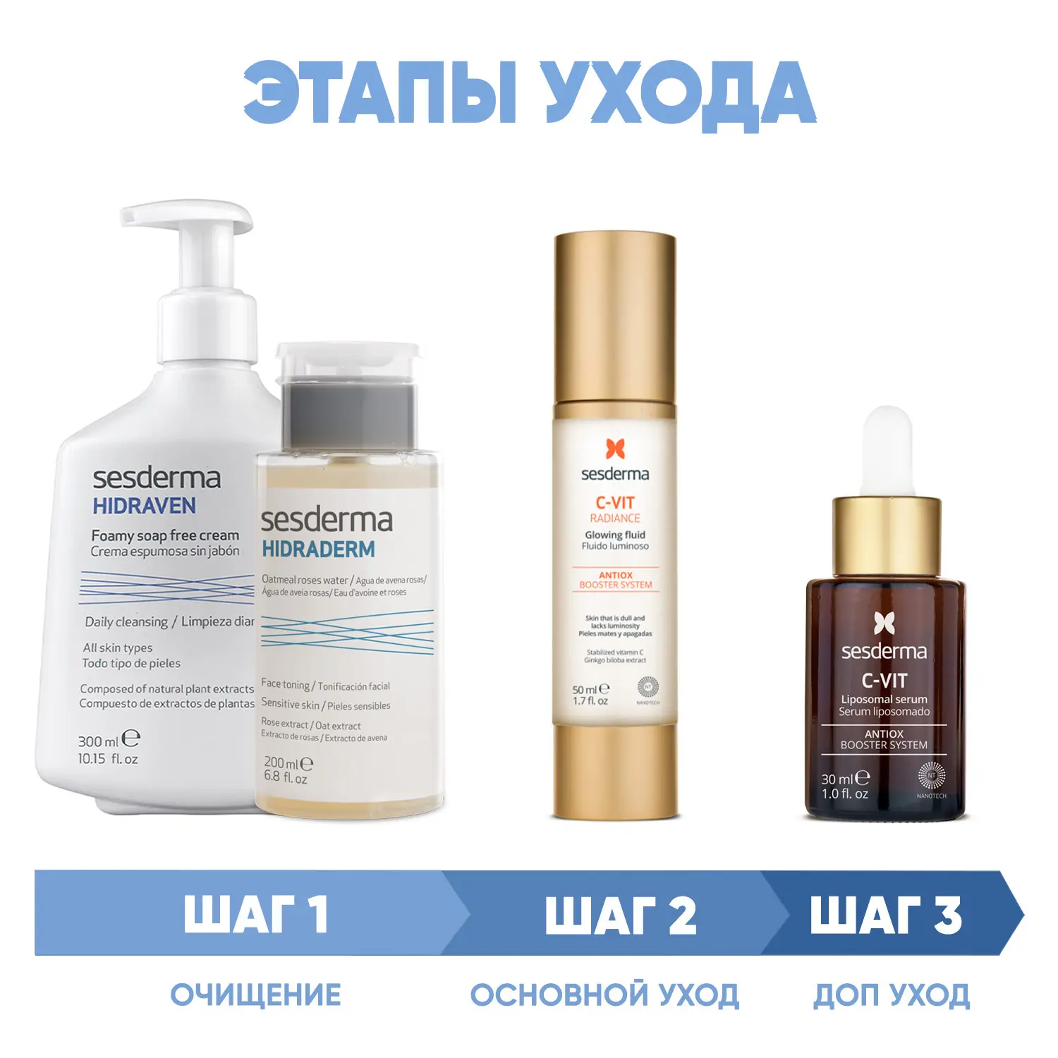 Эксперты проекта «Космедэль»* предлагают ПРОГРАММУ КОМПЛЕКСНОГО УХОДА Sesderma Anti-Age для борьбы с признаками старения лица. Комплексный уход - это дополняющие друг друга средства, совместное использование которых будет максимально эффективным. Первым шагом такой программы всегда является очищение. Вторым - основной уход, а третим - дополнительный уход.