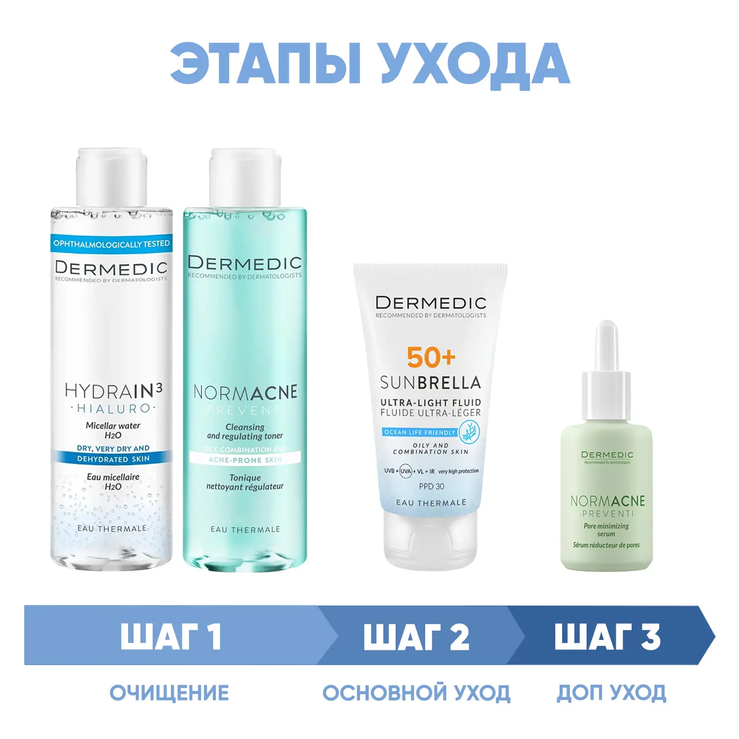 Программа Normacne комплексный уход: мицеллярная вода 200 мл + тоник 200 мл + флюид SPF50+ 40 мл + сыворотка 30 мл